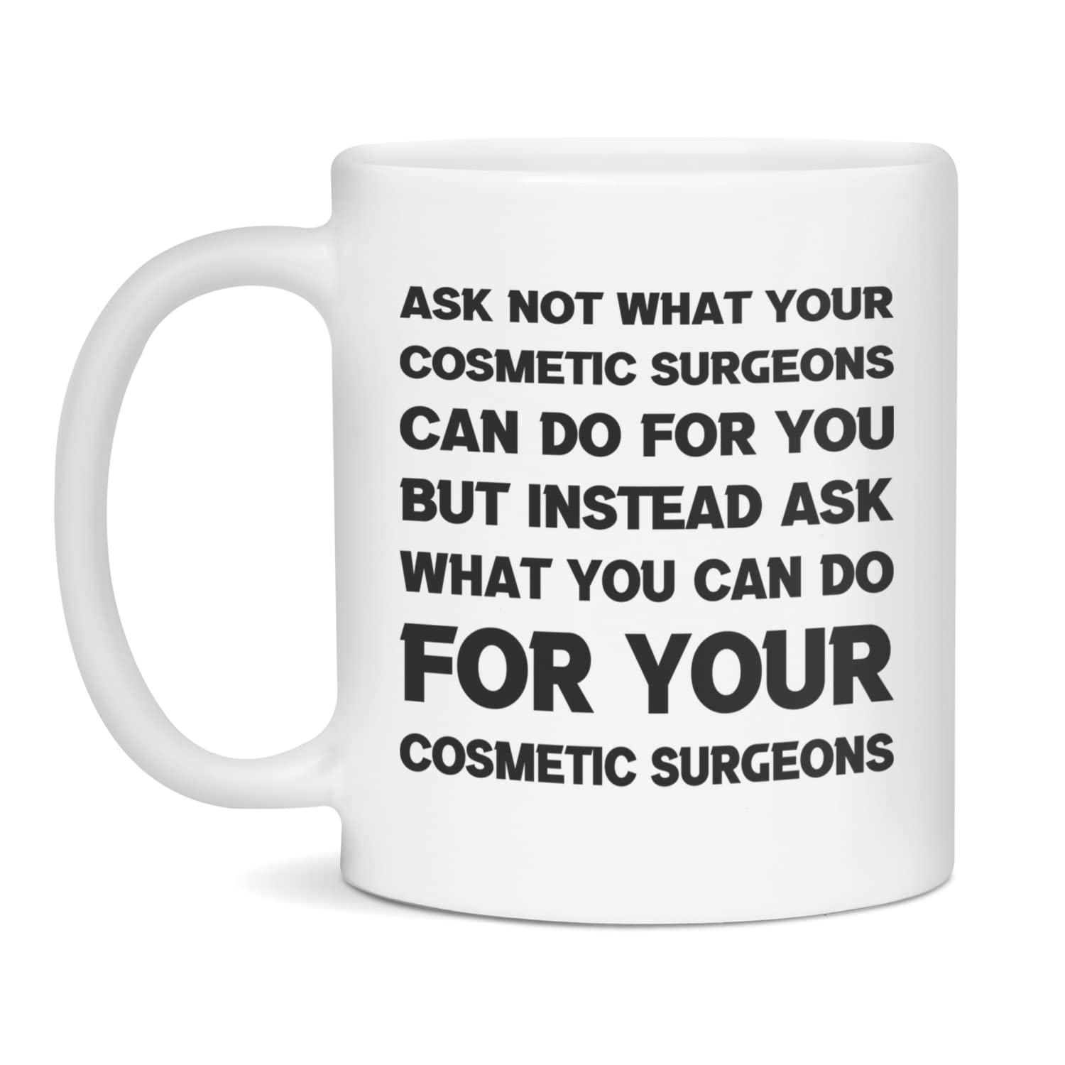 ?? Perfect gift for Cosmetic Surgeons. ?? Dishwasher and microwave safe - The office mug is microwave and dishwasher safe, but it is not recommended to wash in a dishwasher as this will promote fading and gradual loss of the imprint. We highly recommend hand washing so that the imprint will last longer. Special text on the mug is printed on both sides: Ask not what your Cosmetic Surgeons can do for you, but instead ask what you can do for your Cosmetic Surgeons. Perfect for coworker, office, retirement, welcome office party for Christmas, birthday or job anniversary.