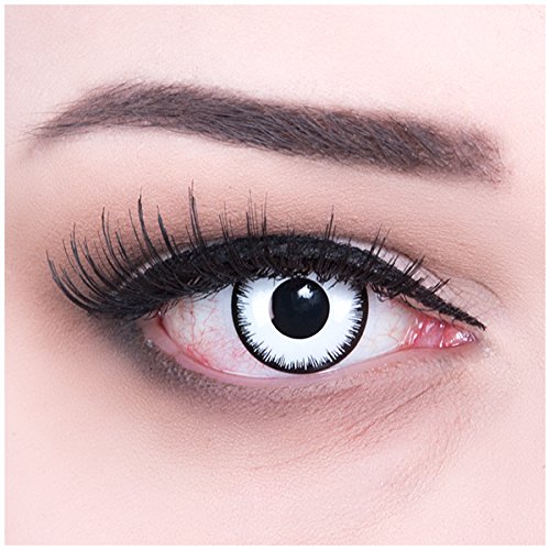 Values: soft contact lenses without strength: 0.0 diopters : Diameter: 14.0mm, radius of curvature: 8.60 , water content: 38 , annual lenses, i.e. 12 months applicable.Universally fitting: opaque for every eye color - bright as well as dark brown eyes Can be used for large and small eyes - ideally suited as a horror costume cladding.Super effect: Extremely creepy motif lenses Fun Crazy Set for your cladding as a vampire, zombie, demon, spirit, Werwolf, Volturi, Cosplay, manga, sharingan - or simply for the next Halloween party with or without make -up.Advantages: Detailed operating instructions in several languages free contact lens containers video tutorials 10 years Meralens Funnylens experience.TOP quality: Colorful contact lenses motif contact lenses branded product brand quality of funnylens suitable for every Halloween costume and carnival costume.