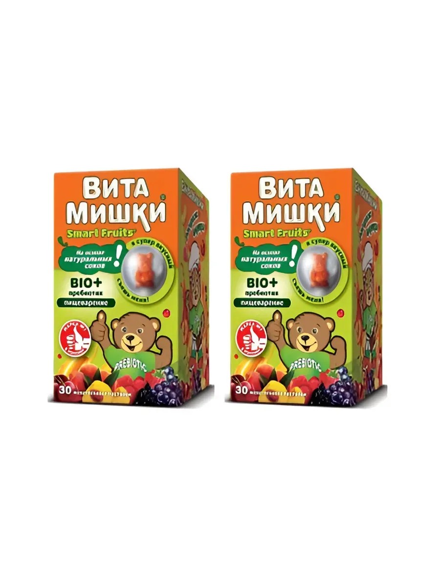 Линия биокомплексов ВитаМишки - вкусные детские витамины №1 в России - жевательные мармеладные мишки на основе натуральных соков.ВитаМишки Bio+ пребиотик - сбалансированный витаминный комплекс с пребиотиками в виде вкусных мармеладных пастилок в форме фигурок мишек с вишневым, малиновым, персиковым и виноградным вкусом.Сбалансированный комплекс витаминов с пребиотиком с натуральными фруктовыми и овощными экстрактами для детей с 3-х лет.• Входящие в состав комплекса инулин, фруктоолигосахариды и экстракт плодов фенхеля способствуют восстановлению полезной микрофлоры кишечника, улучшают пищеварение и нормализуют аппетит.• Способствует регулярному освобождению кишечника.• Обогащает детский организм витаминами группы В.