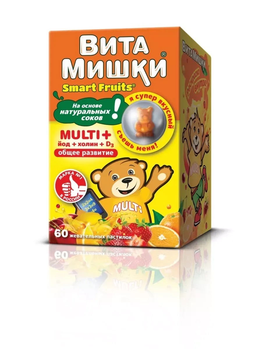 Линия биокомплексов ВитаМишки - вкусные детские витамины №1 в России - жевательные мармеладные мишки на основе натуральных соков.ВитаМишки Multi+ йод и холин - сбалансированный витаминно-минеральный комплекс в виде вкусных мармеладных пастилок-мишек с натуральными фруктовыми и овощными экстрактами для детей с 3-х лет.• Оказывает общеукрепляющее действие.• Поддерживает организм при умственных и физических нагрузках.• Способствует интеллектуальному развитию ребёнка.