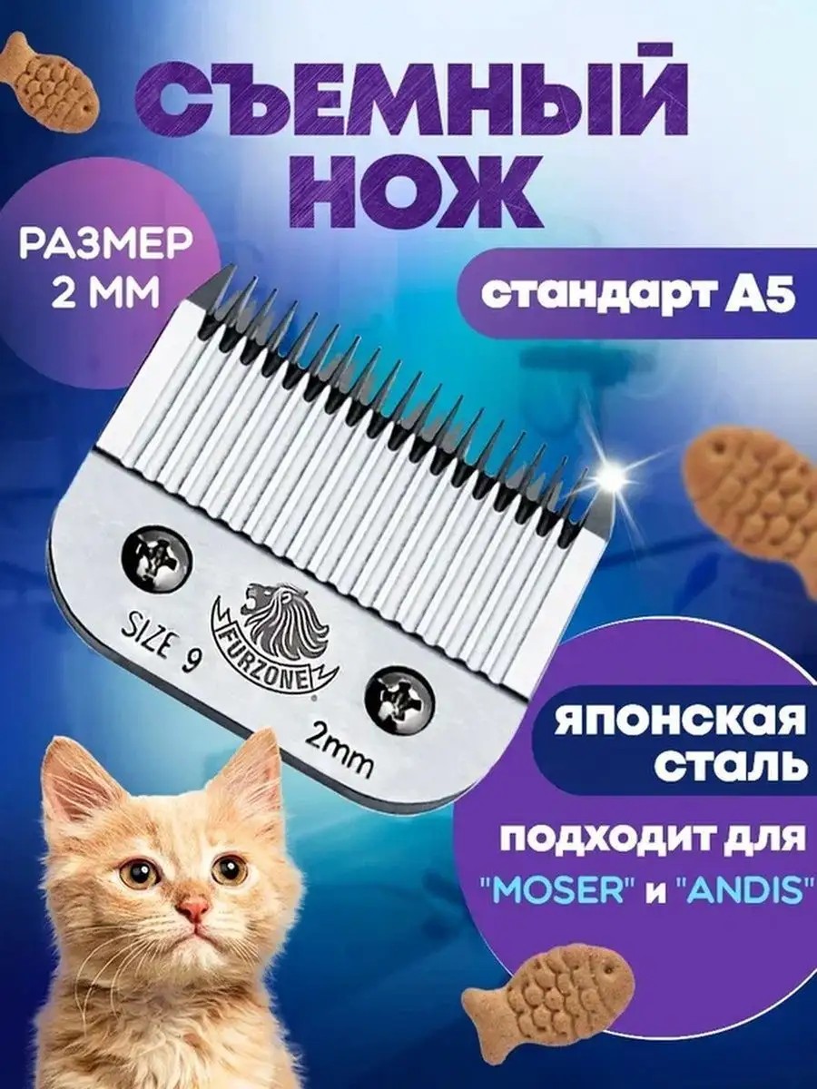 Съемный нож подходит для большинства стандартных моделей машинок с ножами а5, например: Furzone 610; Wahl KM2, KM5, KM10; Andis AG, AGC, BDC, BG, DBLC, FHC, MBG, SMC; Oster A6, Golden A5, Turbo A5, Power Max, PowerPro Ultra; Moser Max 45, 50.