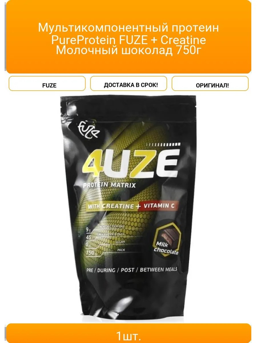 | Комплектация | Мультикомпонентный протеин PureProtein FUZE + Creatine Молочный шоколад 750г |