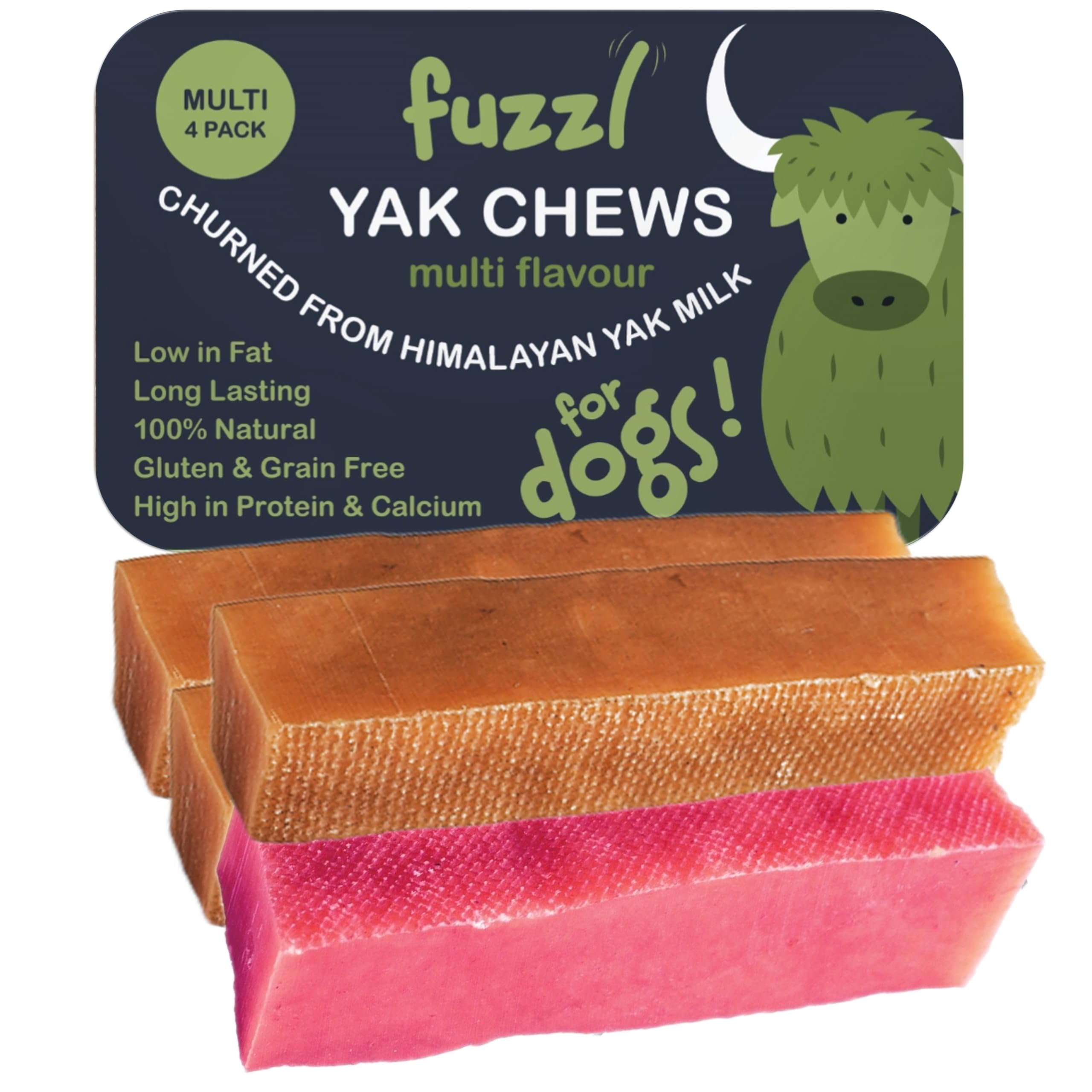 Healthy Gluten Grain Free Dog Treats: These calming dog treats are the perfect rawhide-free chews and ideal treats for large, medium, and small dogs. Enjoy Fuzzl Dog Treats. Natural Dental Chews: Dogs will love Fuzzl Yak Chews and they have the added bonus of being excellent teeth cleaning treats. This dog food is a delicious treat for small, medium, and large dogs and a great alternative to dog bones. Healthy, Nutritious, and Low in Fat: High in protein and calcium, our Yak Chews make a great snack for dogs. Unlike rawhide, these teeth cleaning dog sticks are great for your pets' digestive system. Delicious Long-Lasting Dog Chew: This long-lasting chew will provide your dog with a delicious source of calcium and protein. The size and texture will ensure your dog will be occupied for hours and receive important nutrients. Multi-Color Pack of 100 Natural Dog Chew Toys - Contains 4 irresistible flavors: Original, Superfood Turmeric, Strawberry, and Coconut. All Fuzzl Yak Natural Chew Toys are made with 100 natural, premium ingredients. At Fuzzl, only the best natural ingredients are used. This Yak Dog Chew Toy is made from Himalayan Yak Milk, giving your furry friend a delicious natural treat.Friandises pour chien saines sans gluten ni céréales: Ces friandises calmantes pour chien sont les parfaites friandises à mâcher sans cuir brut et les friandises idéales pour les grands, moyens et petits chiens. Profitez des friandises naturelles Fuzzl Dog Treats. Friandises à mâcher dentaires naturelles: Les chiens adoreront les Fuzzl Yak Chews et ils ont l'avantage supplémentaire d'être d'excellentes friandises pour nettoyer les dents. Cette nourriture pour chien est une délicieuse friandise pour les petits, moyens et grands chiens et une excellente alternative aux os pour chien. Saines, nutritives et faibles en matière grasse: Riches en protéines et en calcium, nos Yak Chews constituent un excellent en-cas pour les chiens. Contrairement au cuir brut, ces bâtonnets de nettoyage des dents pour chien sont parfaits pour le système digestif de vos animaux. Délicieuse friandise à mâcher longue durée pour chien: Cette friandise à mâcher longue durée fournira à votre chien une délicieuse source de calcium et de protéines. La taille et la texture garantiront que votre chien sera occupé pendant des heures et recevra des nutriments importants. Pack Multicolore de Jouets à Mâcher 100 Naturels pour Chiens - Contient 4 saveurs irrésistibles : Original, Superfood Curcuma, Fraise et Noix de Coco. Tous les Jouets à Mâcher Naturels Fuzzl Yak sont fabriqués avec des ingrédients 100 naturels et de première qualité. Chez Fuzzl, seuls les meilleurs ingrédients naturels sont utilisés. Ce Jouet à Mâcher Yak pour Chiens est fabriqué à partir de Lait de Yak de l'Himalaya, offrant à votre compagnon à quatre pattes une délicieuse friandise naturelle.