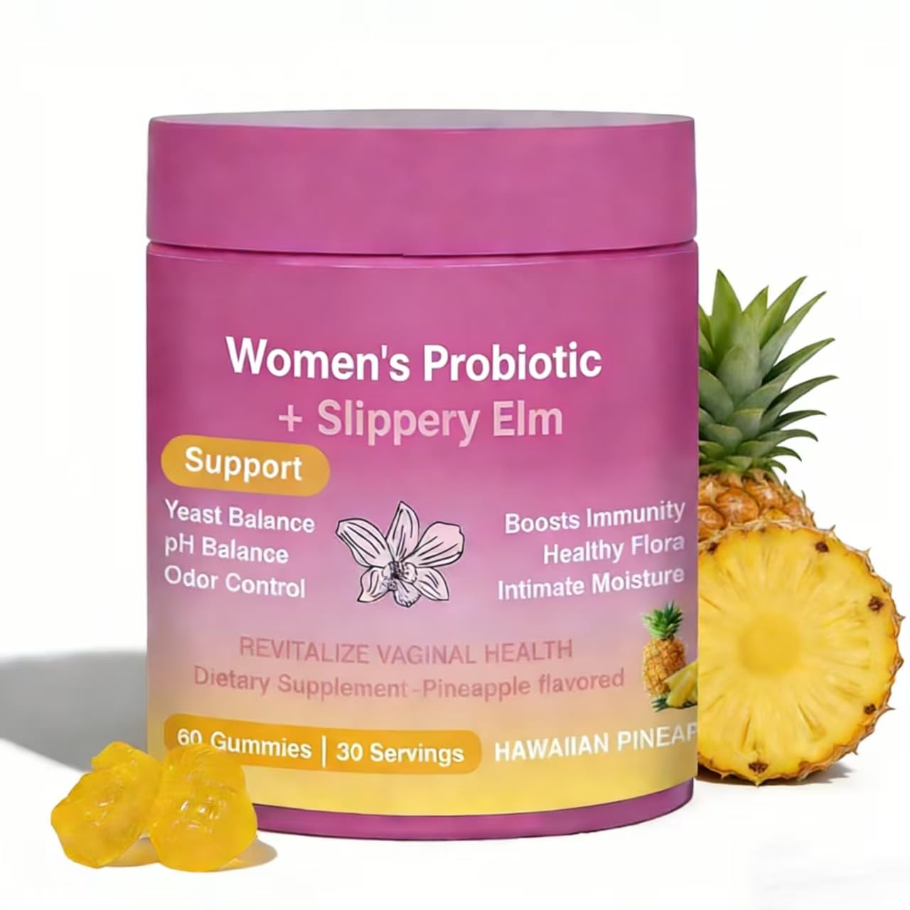 Trusted Quality Clean Ingredients:Gluten-free, soy-free, and free from artificial colors. Produced in certified facilities under strict quality controls to ensure purity, potency, and a reliable health supplement you can trust. Convenient Tasty Gummy Format:Say goodbye to hard-to-swallow pills. These soft, juicy gummies offer a delicious and easy way to get your daily probiotics—perfect for on-the-go lifestyles. Dual Health Support: Gut Digestive System:Each serving contains active probiotics to help balance gut flora and promote digestive health, enhanced with natural slippery elm to gently soothe the digestive tract for dual-care support. Delicious Pineapple Flavor 100 Vegan:Made with naturally sweet pineapple flavor for an enjoyable daily treat. Completely vegan—free from gelatin, artificial flavors, and animal-derived ingredients—suitable for vegans and those with dietary preferences. Women's Health pH Balance Support:Specially formulated for women's wellness needs, this product includes pH-balancing ingredients to help maintain a healthy intimate environment while supporting whole-body probiotic supplementation for overall well-being.
