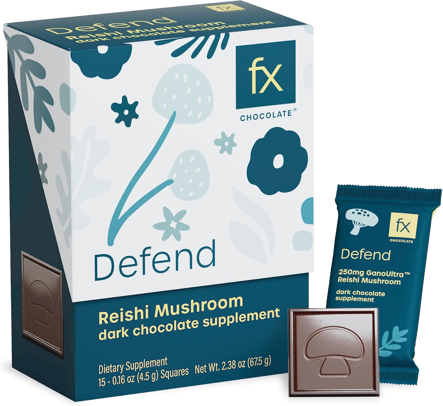 Fx Chocolate Defend - Sugar Free Adaptogen Mushroom Chocolate Supplement for Energy + Immune Support with Cacao + Reishi - Keto Dark Chocolate - Vegan + Non-GMO (Box of 15)
