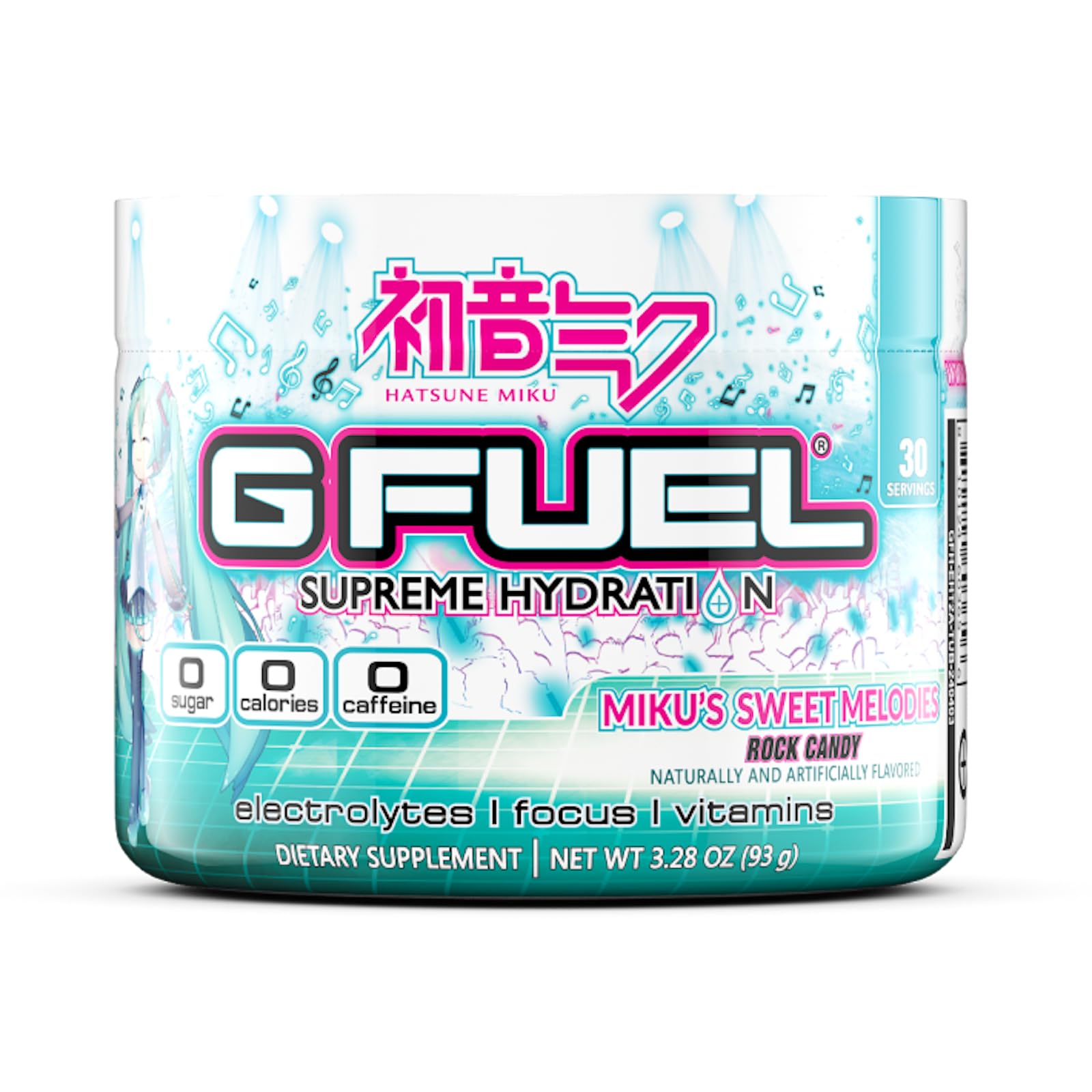 Stay refreshed, recharged, and ready with G Fuel Sweet Melodies Supreme Hydration – a delicious watermelon strawberry electrolyte powder mix inspired by the pop music sensation Hatsune Miku. Whether you're gaming late into the night, grinding through a workout, or just pushing through a busy day, this sugar-free, caffeine-free hydration supplement is designed to keep you focused and fueled — without the crash. Enjoy the sweet harmony of rock candy-inspired watermelon and strawberry flavor in every sip. With zero sugar, zero caffeine, and zero calories, it's clean hydration you can feel good about. No jitters. No junk. Just smooth, effective support to keep your body and brain in sync. Our Supreme Hydration formula delivers a powerful blend of electrolytes (magnesium, potassium, and sodium) to help replenish lost minerals, support nerve and muscle function, and aid in post-workout recovery. Plus, we've added essential focus aminos and vitamins — including Vitamin D3, C, E, B6, and B12 — to help support energy, mental clarity, and hydration at a cellular level. This isn't just another hydration powder — it's your go-to gamer fuel, your daily hydration mix, and your clean workout support all in one. With 30 servings per tub, it's easy to mix and perfect for water bottles, shakers, or hydration packs. Whether you're chg high scores or gains at the gym, G Fuel Sweet Melodies is the ultimate hydration supplement for performance and flavor. G FUEL Supreme Hydration — Fuel Your Big Brain. Rehydrate. Refocus. Repeat.CLEAN HYDRATION FUEL: Power through gaming, workouts, or long days with G Fuel's zero sugar, caffeine-free hydration powder. The best electrolyte powder drink mix to rehydrate, boost focus, and support energy — anytime, anywhere. SMART HYDRATION WITH VITAMIN POWER: Packed with essential vitamins B6, B12, D3, C, E, our Supreme Hydration electrolyte powder mix is a zero sugar, caffeine-free energy drink mix designed to keep you hydrated while supporting brain health and overall vitality for work, study, or active lifestyles. ELECTROLYTE ENHANCED: This hydration powder mix delivers essential minerals — magnesium, potassium, and sodium to support muscle and nerve function. Perfect for post-workout recovery, rehydration, and instant focus without sugar or caffeine. ZERO EVERYTHING: No caffeine, no sugar, no calories — just clean, effective hydration. Our Supreme Hydration electrolyte powder is expertly formulated to effectively support hydration and rejuvenation without the crash, jitters, or added junk. SWEET WATERMELON STRAWBERRY FLAVOR: Inspired by Hatsune Miku, our Sweet Melodies Supreme Hydration electrolyte powder mix delivers a refreshing burst of watermelon and strawberry. Packed with enhanced electrolytes to rehydrate, refuel, and support focus!.