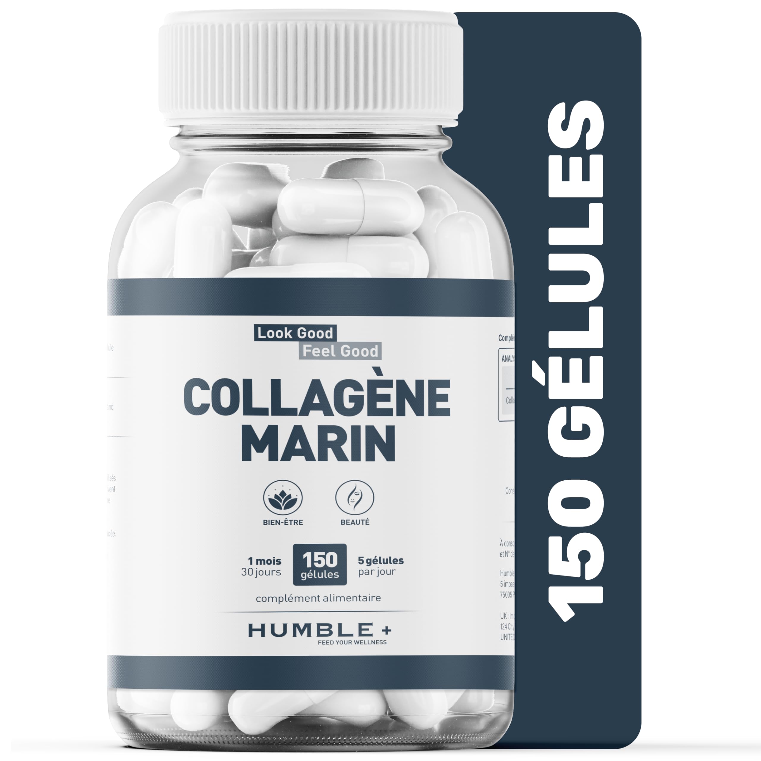 Trusted Quality: Proudly made in France, our marine collagen capsules meet the highest quality standards, ensuring a reliable addition to your wellness routine. ? Convenience and Efficacy: Simplify your beauty routine with just 5 capsules a day—no powder mixes or unpleasant tastes. Enjoy visible results effortlessly in your daily life. Proven Results: Clinical studies show that after 8 weeks of taking our capsules, users experienced a 42 reduction in wrinkles, a 12 increase in hydration, a 31 improvement in radiance, and a 34 evenness in skin tone. Maximum Absorption: Our hydrolyzed collagen has a low molecular weight of 1000 Daltons and a tripeptide concentration close to 25 , ensuring superior absorption for optimal skin benefits. Revolutionary Collagen Source: Discover the power of ultra-concentrated marine collagen with just 5 capsules a day, providing 2.5g of collagen. Equivalent to 5g of powder, our patented formula maximizes effectiveness, backed by clinical research.Une qualité digne de confiance : Fièrement fabriquées en France, nos capsules de collagène marin respectent les plus hauts standards de qualité, garantissant un ajout fiable à votre routine bien-être. ? Commodité et Efficacité : Simplifiez votre routine de beauté avec seulement 5 capsules par jour—pas de mélanges de poudres ni de goûts désagréables. Profitez de résultats visibles sans effort dans votre vie quotidienne. Résultats Prouvés : Des études cliniques montrent qu'après 8 semaines de prise de nos capsules, les utilisateurs ont constaté une réduction de 42 des rides, une augmentation de 12 de l'hydratation, une amélioration de 31 de la radiance et une uniformité de 34 du teint de la peau. Absorption Maximale : Notre collagène hydrolysé présente un faible poids moléculaire de 1000 Daltons et une concentration en tripeptides proche de 25 , garantissant une absorption supérieure pour des bénéfices cutanés optimaux. Source de Collagène Révolutionnaire : Découvrez le pouvoir du collagène marin ultra-concentré avec seulement 5 capsules par jour, fournissant 2,5 g de collagène. Équivalent à 5 g de poudre, notre formule brevetée maximise l'efficacité, soutenue par des recherches cliniques.Gélules Collagene Marin Ultra-Concentrées - 150 Capsules - 2,5 g de Tripeptides Hydrolysés pour une Meilleure Santé de la Peau - 5 Capsules Jour - Fabriqué en France