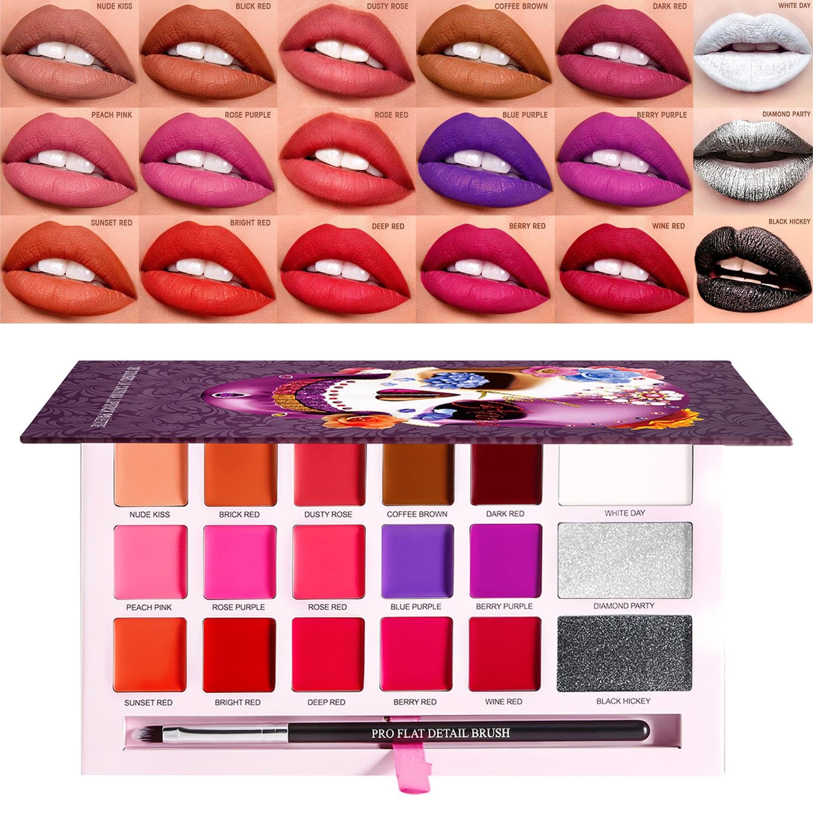 DESCRIPTION DU PRODUIT DESCRIPTION DU PRODUIT : Unleash your creativity with this 18-color lipstick palette, designed to offer a stunning variety of highly pigmented shades that suit any occasion. Whether you prefer bold, dramatic looks for Halloween costumes, performances, or themed parties, or soft, natural hues for everyday wear, this palette has it all. Featuring a waterproof and smudge-resistant formula, each shade stays put throughout the day without fading or transferring. The moisturizing ingredients ensure lips remain smooth and hydrated, providing a comfortable feel with a creamy, blendable texture. Choose between matte and glossy finishes to create endless styles, from sophisticated to bold. With its compact, travel-friendly design, this palette is a must-have for makeup artists, beauty lovers, and anyone looking to their lip game with long-lasting, vibrant colors. Specifications: Net content: 25g Product size: as shown in the pic Packing List: 1 pieces lipstick palette Note: Due to different lighting and screen settings, the item color may be slightly different from the picture. Due to different manual measurements, please allow a 1-2cm difference in size. AVERTISSEMENT DE SÉCURITÉ N'est pas applicableCompact and Travel-Friendly for Easy On-the-Go Application: Designed for convenience with a sleek, lightweight case that fits effortlessly in makeup bags, making it an ideal choice for makeup artists, beauty enthusiasts, and travelers. Matte and Glossy Finishes for a Variety of Styles: Features a mix of matte and glossy shades that provide different effects, enabling seamless transitions from natural everyday looks to bold and dramatic makeup for special occasions. Moisturizing Ingredients for Soft and Hydrated Lips: Infused with nourishing components to keep lips feeling smooth and comfortable, preventing dryness and cracking while delivering a creamy, lightweight texture that glides effortlessly. Waterproof and Smudge-Resistant Formula for Long-Lasting Wear: Specially designed for extended wear without fading or transferring, making it perfect for all-day events, stage performances, costume makeup, and long celebrations. 18 Richly Pigmented Colors for Versatile Makeup Looks: A stunning selection of vibrant shades ranging from bold reds and deep plums to soft nudes and classic pinks, allowing for endless creative lip combinations and custom blending.18 Color Lipstick Palette, High Pigment Shades, Moisturizing Smudge Resistant, Smooth Application, All Day Comfort for Themed Events, Gatherings, and Makeup ArtistsDESCRIPTION DU PRODUIT DESCRIPTION DU PRODUIT : Unleash your creativity with this 18-color lipstick palette, designed to offer a stunning variety of highly pigmented shades that suit any occasion. Whether you prefer bold, dramatic looks for Halloween costumes, performances, or themed parties, or soft, natural hues for everyday wear, this palette has it all. Featuring a waterproof and smudge-resistant formula, each shade stays put throughout the day without fading or transferring. The moisturizing ingredients ensure lips remain smooth and hydrated, providing a comfortable feel with a creamy, blendable texture. Choose between matte and glossy finishes to create endless styles, from sophisticated to bold. With its compact, travel-friendly design, this palette is a must-have for makeup artists, beauty lovers, and anyone looking to their lip game with long-lasting, vibrant colors. Specifications: Net content: 25g Product size: as shown in the pic Packing List: 1 pieces lipstick palette Note: Due to different lighting and screen settings, the item color may be slightly different from the picture. Due to different manual measurements, please allow a 1-2cm difference in size. AVERTISSEMENT DE SÉCURITÉ N'est pas applicableCompact and Travel-Friendly for Easy On-the-Go Application: Designed for convenience with a sleek, lightweight case that fits effortlessly in makeup bags, making it an ideal choice for makeup artists, beauty enthusiasts, and travelers. Matte and Glossy Finishes for a Variety of Styles: Features a mix of matte and glossy shades that provide different effects, enabling seamless transitions from natural everyday looks to bold and dramatic makeup for special occasions. Moisturizing Ingredients for Soft and Hydrated Lips: Infused with nourishing components to keep lips feeling smooth and comfortable, preventing dryness and cracking while delivering a creamy, lightweight texture that glides effortlessly. Waterproof and Smudge-Resistant Formula for Long-Lasting Wear: Specially designed for extended wear without fading or transferring, making it perfect for all-day events, stage performances, costume makeup, and long celebrations. 18 Richly Pigmented Colors for Versatile Makeup Looks: A stunning selection of vibrant shades ranging from bold reds and deep plums to soft nudes and classic pinks, allowing for endless creative lip combinations and custom blending.