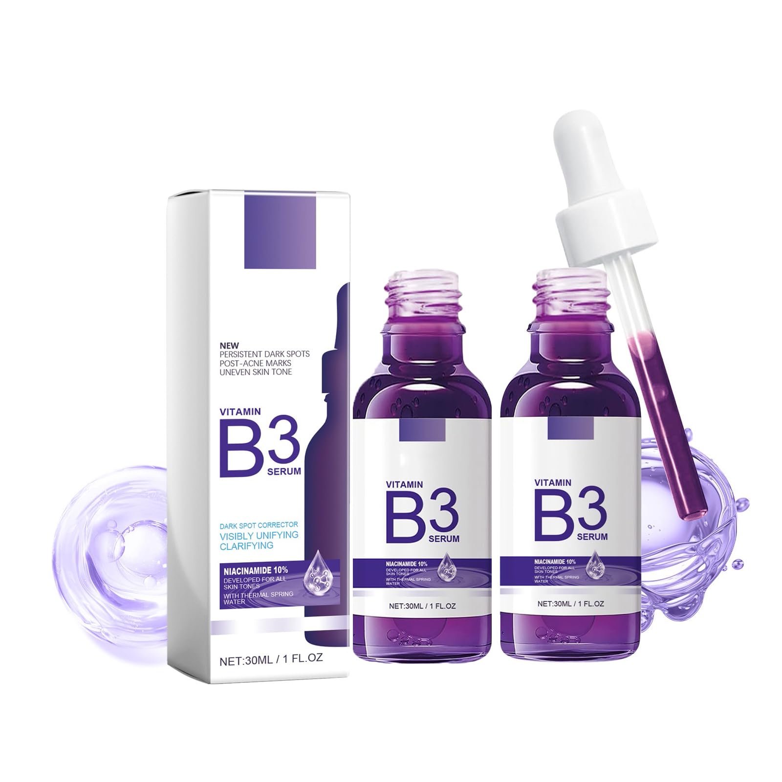 DESCRIPTION DU PRODUIT DESCRIPTION DU PRODUIT B3 Vitamin B3 Serum Dark Spot Corrector, Niacinamide Face Serum, Anti-Wrinkle Face Serum,Firms Brightens Complexion, 30ml AVERTISSEMENT DE SÉCURITÉ For external use only. Avoid contact with eyes and keep away from sources of ignition or direct heat.Skin Types And Skin Concerns: For all skin types, but especially for dry to oily and sensitive skin. Targets skin lacking radiance, bumpy skin, rough skin, dry and aging skin. Intensive Hydration:B3 Vitamin B3 Serum contains hyaluronic acid and vitamin B3 to provide deep hydration and hydration to the skin. Say goodbye to dry, dull skin. Soft But Effective: B3 Vitamin B3 Serum is suitable for all skin types. The lightweight, non-greasy formula absorbs quickly into the skin, providing instant hydration and nutrition without clogging pores or causing irritation. Skin Tone Corrector:Niacinamide helps lighten and even skin tone, reducing the appearance of dark spots, hyperpigmentation and redness. Get a smoother, more even complexion with our B3 Facial Serum. Anti-Aging Properties: Formulated with antioxidants, B3 Vitamin B3 Serum helps minimize the appearance of fine lines and wrinkles, promoting a younger, revitalized complexion. Restore the elasticity and firmness of your skin with regular use of this anti-aging serum.B3 Vitamin B3 Serum Dark Spot Corrector, Niacinamide and Anti-Wrinkle Face Serum, Firms Brightens Complexion, 30ml (2PC)DESCRIPTION DU PRODUIT DESCRIPTION DU PRODUIT B3 Vitamin B3 Serum Dark Spot Corrector, Niacinamide Face Serum, Anti-Wrinkle Face Serum,Firms Brightens Complexion, 30ml AVERTISSEMENT DE SÉCURITÉ For external use only. Avoid contact with eyes and keep away from sources of ignition or direct heat.Skin Types And Skin Concerns: For all skin types, but especially for dry to oily and sensitive skin. Targets skin lacking radiance, bumpy skin, rough skin, dry and aging skin. Intensive Hydration:B3 Vitamin B3 Serum contains hyaluronic acid and vitamin B3 to provide deep hydration and hydration to the skin. Say goodbye to dry, dull skin. Soft But Effective: B3 Vitamin B3 Serum is suitable for all skin types. The lightweight, non-greasy formula absorbs quickly into the skin, providing instant hydration and nutrition without clogging pores or causing irritation. Skin Tone Corrector:Niacinamide helps lighten and even skin tone, reducing the appearance of dark spots, hyperpigmentation and redness. Get a smoother, more even complexion with our B3 Facial Serum. Anti-Aging Properties: Formulated with antioxidants, B3 Vitamin B3 Serum helps minimize the appearance of fine lines and wrinkles, promoting a younger, revitalized complexion. Restore the elasticity and firmness of your skin with regular use of this anti-aging serum.