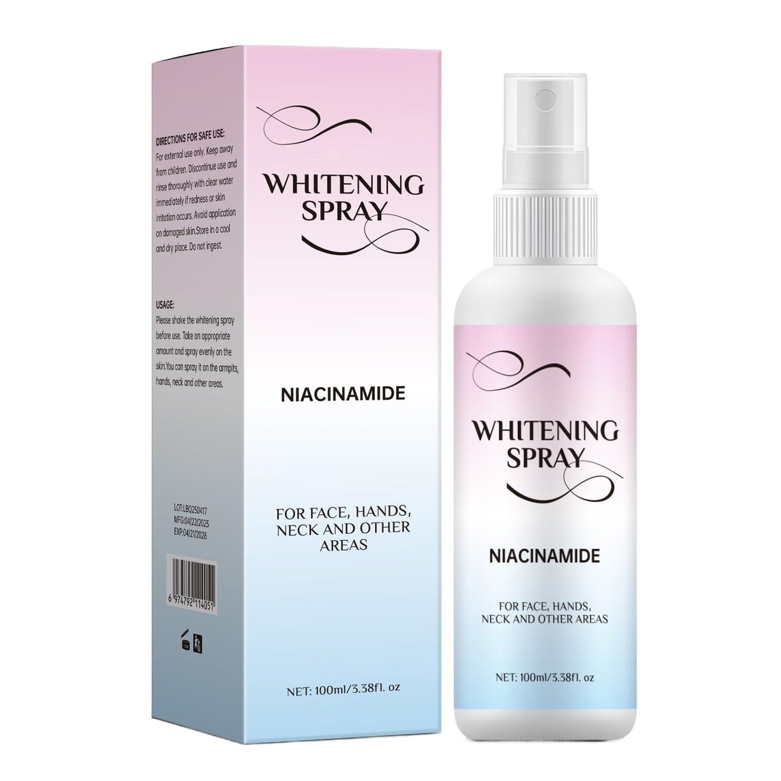 DESCRIPTION DU PRODUIT DESCRIPTION DU PRODUIT Detailed Description Illuminate your skin with the Brightening Body Spray, a 100ml lightening body lotion designed to brighten and protect while keeping your skin and radiant. This fast-absorbing formula provides effective UV protection to shield your skin from harmful sun damage, making it perfect for daily use on legs, neck, hands, and other exposed areas. Its sweatproof, lightweight texture ensures a non-greasy, comfortable feel that stays put even during active days, sports, or outdoor adventures. Enriched with nourishing ingredients, it helps improve skin tone and texture while delivering long-lasting hydration. Main Features: Skin Brightening Lightening: Helps even skin tone and enhances natural radiance. UV Protection: skin from harmful UVA and UVB rays to prevent sun damage. Specifications: Product name: Brightening Body Spray Product size: about 14x3.9cm 5.51x1.54 inches Product weight: 130g Net content: 100ml Packing List: 1 Brightening Body Spray Note: Due to different lighting and screen settings, the item color may be slightly different from the picture. Due to different manual measurements, please allow a 1-2cm difference in size. AVERTISSEMENT DE SÉCURITÉ N'est pas applicableConvenient 100ml Size for Travel and Daily Use: Compact and portable, the 100ml spray bottle fits easily in handbags, gym bags, or travel kits, enabling quick reapplication anytime, anywhere to maintain skin brightness and protection throughout the day. Versatile Use for Multiple Body Areas: Perfect for use on legs, neck, hands, and other exposed skin, this lotion supports skin health and radiance wherever applied, helping to improve moisture retention and skin texture for a polished, cared-for look. Fast-Absorbing and Lightweight Texture: Designed to absorb quickly, this body spray lotion leaves skin feeling soft, smooth, and hydrated without any heavy , making it an ideal beauty accessory for daily routines and makeup prep. UV Protection with Sweatproof Technology: Specially formulated to shield skin from harmful UV rays, this sweat-resistant lotion maintains effective sun defense during outdoor activities or workouts, keeping your skin safe without feeling sticky or greasy throughout the day. Brightening and Lightening Formula for Radiant Skin: This 100ml body spray lotion is enriched with skin-brightening ingredients that help even out skin tone and lighten dark spots on legs, neck, and hands, giving a luminous, youthful glow while protecting against UV damage.Brightening Body Spray, Lightening Lotion, UV Protection Formula, Sweatproof, Fast-Absorbing, 100ml Bottle, for Legs, Neck, Hands, Beauty Care Men Women More Indoor OutdoorDESCRIPTION DU PRODUIT DESCRIPTION DU PRODUIT Detailed Description Illuminate your skin with the Brightening Body Spray, a 100ml lightening body lotion designed to brighten and protect while keeping your skin and radiant. This fast-absorbing formula provides effective UV protection to shield your skin from harmful sun damage, making it perfect for daily use on legs, neck, hands, and other exposed areas. Its sweatproof, lightweight texture ensures a non-greasy, comfortable feel that stays put even during active days, sports, or outdoor adventures. Enriched with nourishing ingredients, it helps improve skin tone and texture while delivering long-lasting hydration. Main Features: Skin Brightening Lightening: Helps even skin tone and enhances natural radiance. UV Protection: skin from harmful UVA and UVB rays to prevent sun damage. Specifications: Product name: Brightening Body Spray Product size: about 14x3.9cm 5.51x1.54 inches Product weight: 130g Net content: 100ml Packing List: 1 Brightening Body Spray Note: Due to different lighting and screen settings, the item color may be slightly different from the picture. Due to different manual measurements, please allow a 1-2cm difference in size. AVERTISSEMENT DE SÉCURITÉ N'est pas applicableConvenient 100ml Size for Travel and Daily Use: Compact and portable, the 100ml spray bottle fits easily in handbags, gym bags, or travel kits, enabling quick reapplication anytime, anywhere to maintain skin brightness and protection throughout the day. Versatile Use for Multiple Body Areas: Perfect for use on legs, neck, hands, and other exposed skin, this lotion supports skin health and radiance wherever applied, helping to improve moisture retention and skin texture for a polished, cared-for look. Fast-Absorbing and Lightweight Texture: Designed to absorb quickly, this body spray lotion leaves skin feeling soft, smooth, and hydrated without any heavy , making it an ideal beauty accessory for daily routines and makeup prep. UV Protection with Sweatproof Technology: Specially formulated to shield skin from harmful UV rays, this sweat-resistant lotion maintains effective sun defense during outdoor activities or workouts, keeping your skin safe without feeling sticky or greasy throughout the day. Brightening and Lightening Formula for Radiant Skin: This 100ml body spray lotion is enriched with skin-brightening ingredients that help even out skin tone and lighten dark spots on legs, neck, and hands, giving a luminous, youthful glow while protecting against UV damage.