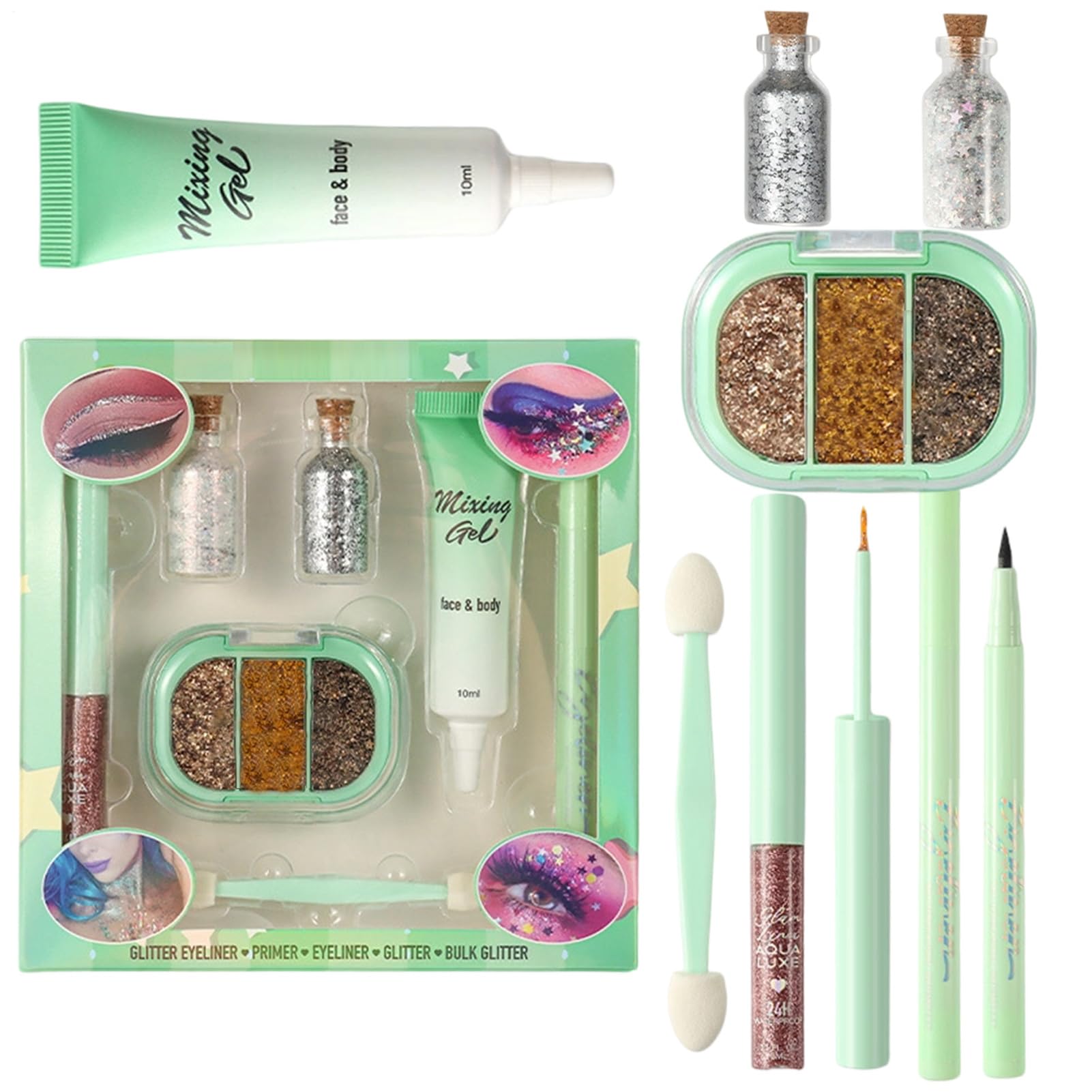 Vibrant, sweat-resistant eyeshadow: This set delivers high-performance eyeshadow that stays put despite sweat and water exposure. It ensures long-lasting beauty for workouts, vacations, or any occasion requiring reliable, flawless cosmetic performance. Easily enhance your look: Featuring a shimmering eyeshadow palette, eyeliner, and glitter gel primer, this versatile eye makeup kit allows for easy application and luminous finishes. Ideal for creating captivating looks at weddings or festivals. Guaranteed quick application: These makeup kits for women are designed to simplify your beauty routine with quick eye makeup solutions. The glitter gel glides on smoothly, and the precise eyeliner pencil makes it easy to create a stunning cut-crease eyeshadow style, even on the busiest days. For sensitive eyes: The creamy texture of this eyeshadow is gentle and kind to sensitive eyes, for irritation-free application. Its subtle shimmer and long-lasting comfort make it perfect for any occasion, from the office to casual outings. Captivating evening makeup: This glitter eyeshadow combines fine and larger sparkles, creating buildable intensity perfect for party-ready eye makeup or adding a dramatic touch to a themed event look. It delivers a photogenic result every time, without compromising comfort or ease of application.