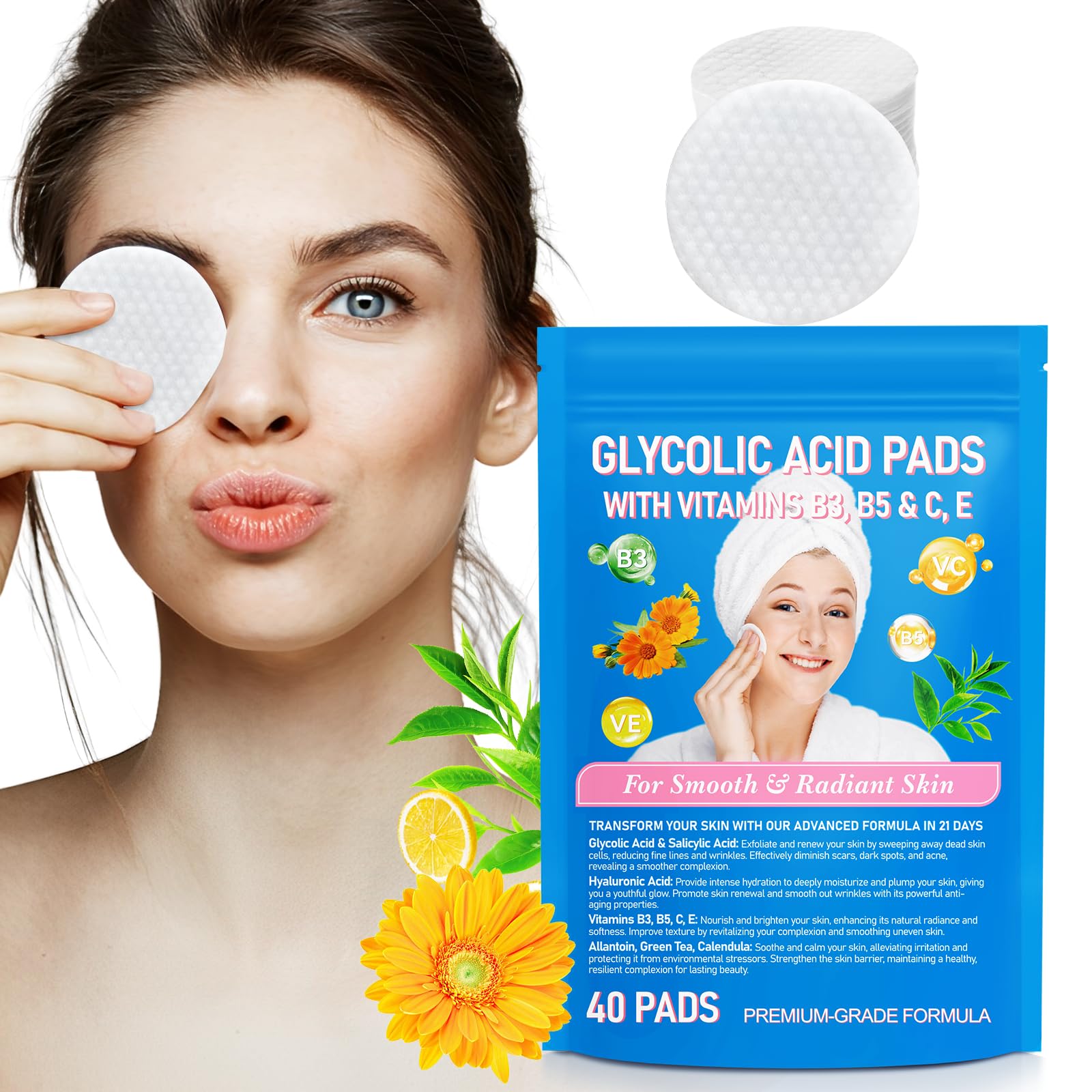 : b For smooth, radiant skin Advanced 20 Collagen Renewal Advanced Formula 40 capsules b Directions for Use: B 1. Gently cleanse and dry your face. 2. Use the textured side of the mat and gently wipe your skin, avoiding the eye area. 3. Wait 2-3 minutes, then wipe off the formula with the smooth side of the pad. 4. Rinse your face and follow your standard skincare routine. Recommended for evening use apply sunscreen if exfoliating during the day. B SAFETY WARNING 1Vitamins B3, B5, C, and E ? Nourishes and brightens the skin, enhancing its natural radiance and softness. Improves texture by restoring tone and smoothing uneven skin. Hyaluronic acid provides powerful hydration, deep moisture, and plumps the skin, reducing fine lines. Even Tones and Textures ? Achieve a more even skin tone and smoother texture with our glycolic acid pads. Whether you're struggling with hyperpigmentation, uneven skin texture, or rough patches, these pads gently exfoliate and brighten to reveal a more even complexion. Minimize Wrinkles and Fine Lines ? Say goodbye to dull, aging skin. Our glycolic acid pads promote cell renewal and reduce the appearance of wrinkles and fine lines. Regular use helps boost collagen production, restore elasticity, and leave skin feeling firmer and more youthful. Beauty One Glycolic Acid Exfoliation ? Our formulas contain glycolic acid, salicylic acid, hyaluronic acid, various vitamins, and allantoin. Gently remove impurities, resolve all types of skin problems, and restore delicate, smooth skin in 21 days. Suitable for all skin types. Safe, gentle, and effective ? A daily skincare mat containing the right amounts of salicylic and glycolic acid to effectively and safely exfoliate, tone, and brighten all skin types, including sensitive skin even better, these mats are now compostable for daily use.Masque À L'Acide Glycolique, Peau Régénérée Exfoliante Pour Une Peau Plus Propre Et Plus Lisse - Vitamines B3, B5, C, E- Efficace Pour Réduire Les Taches Sombres,Les Ridules Et Les Rides(40 Comprimés)DESCRIPTION DU PRODUIT DESCRIPTION DU PRODUIT Description du produit: b pour une peau lisse et éclatante Advanced 20 Collagen Renewal Advanced Formula 40 capsules b mode d'emploi: B 1. Nettoyez et séchez délicatement le visage. 2. Utilisez le côté Texturé du tapis et essuyez doucement la peau en évitant la zone des yeux. 3. Attendez 2 - 3 minutes, puis essuyez la formule avec le côté lisse du coussin. 4. Rincez votre visage et suivez une routine de soins standard. recommandé le soir Appliquer un écran solaire si vous exfoliez pendant la journée. B AVERTISSEMENT DE SÉCURITÉ 1Vitamines B3, B5, C et e ? Nourrit et illumine la peau, améliore son éclat naturel et sa douceur. Améliore la texture en rétablissant le teint et en lissant la peau inégale. L'acide hyaluronique procure une hydratation puissante, une hydratation profonde et une peau repulpée, réduisant les ridules. Tons et textures uniformes ? Obtenez un teint plus uniforme et une texture plus lisse avec nos tampons d'acide glycolique. Que vous luttiez avec une hyperpigmentation, une texture inégale de la peau ou des plaques rugueuses, ces coussins exfolient et éclaircissent en douceur pour révéler un teint plus uniforme. Minimiser les rides et ridules ? Dites adieu à la peau terne et vieillissante. Nos tampons d'acide glycolique favorisent le renouvellement cellulaire et réduisent l'apparence des rides et ridules. L'utilisation régulière aide à stimuler la production de collagène, à restaurer l'élasticité et à rendre le teint plus ferme et plus jeune. Exfoliation à l'acide glycolique Beauty one ? Nos formules contiennent de l'acide glycolique, de l'acide salicylique, de l'acide hyaluronique, diverses vitamines et de l'Allantoïne. Supprimez les impuretés en douceur, résolvez tous les types de problèmes de peau et Restaurez une peau délicate et lisse en 21 jours. Convient à toutes les peaux. Sûr, doux efficace ? Un tapis de soin quotidien contenant les bonnes quantités d'acide salicylique et glycolique pour aider efficacement et en toute sécurité à exfolier, tonifier et éclaircir tous les types de peau, y compris les peaux sensibles Mieux encore, ces tapis sont maintenant compostables pour une utilisation quotidienne.