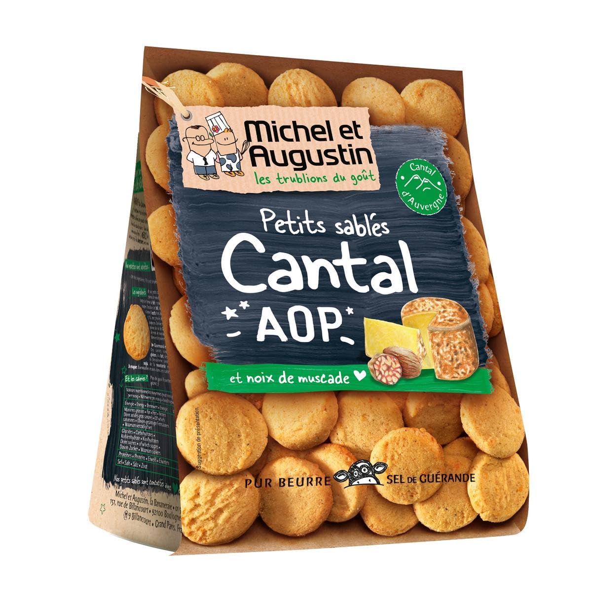Delicious little shortbread cookies made with fresh butter and a touch of Guérande salt, flavored with Cantal cheese and nutmeg. So good! INGREDIENTS WHEAT flour, BUTTER 25 , WHEAT starch, Sainte-Maure-de-Touraine PDO cheese 10 , skimmed MILK powder, Guérande salt 1.7 , sugar, flavoring (contains MILK), savory (x ), white pepper. May contain traces of nuts, soy, mustard, and eggs.