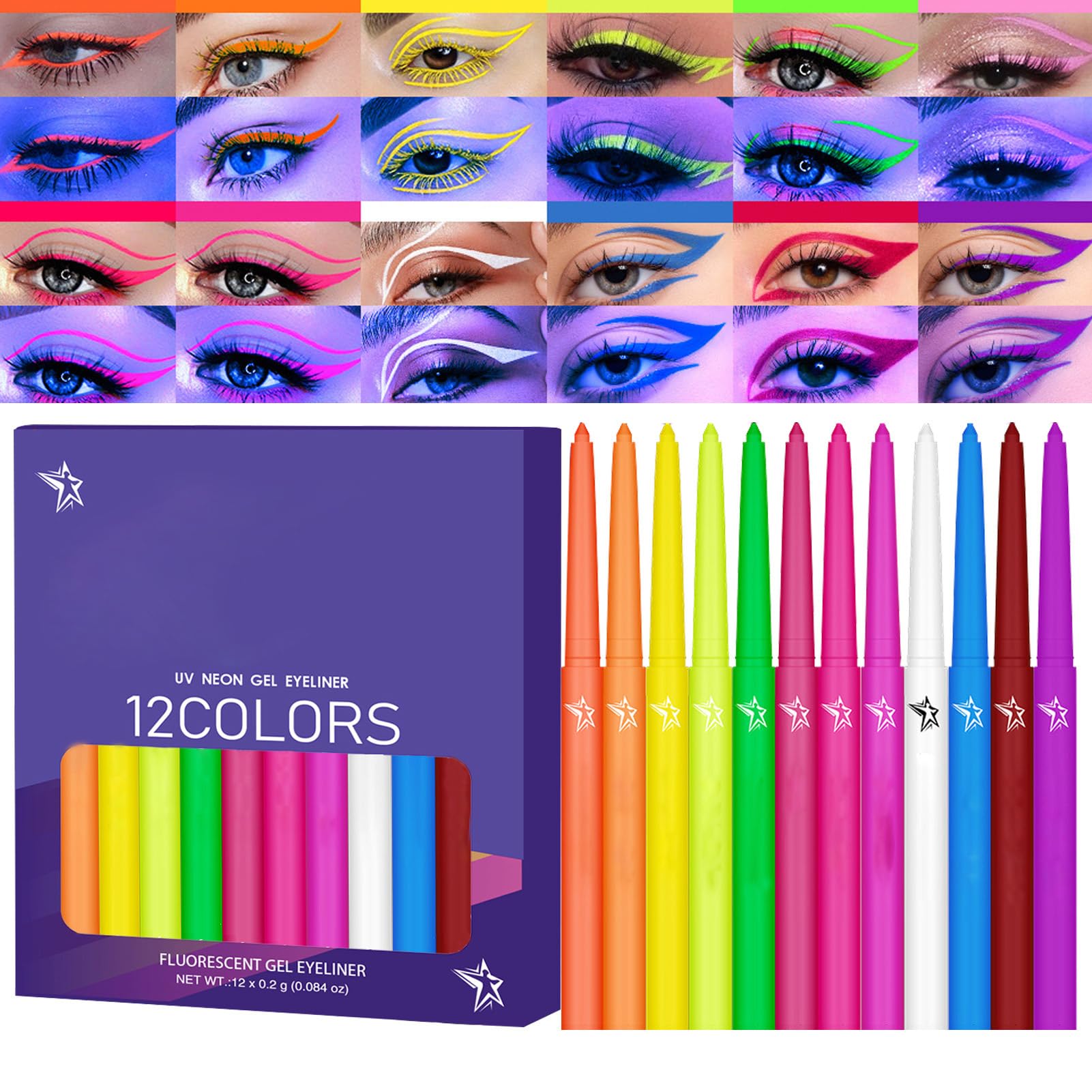 Perfect Gift: This set of 12 colored liquid eyeliners comes in a gift box, perfect for your family on special occasions, making it the best choice for Valentine's Day, birthdays, Halloween, Christmas, or any other holiday. Easy to Use: The retractable tip of our colored liquid eyeliner is perfect for beginners. Its smooth tip allows for better control, resulting in beautiful and delicate eyeliner. Effortlessly create smoky eyes with a three-dimensional contour. Long-Lasting and Waterproof: Achieve perfect makeup all day long thanks to this smudge-proof and sweat-resistant formula that won't smudge or flake when washed. Smooth and Defined Lines: Our colored liquid eyeliner features a natural and comfortable formula, allowing for easy and precise application. Its quick-drying, highly pigmented, and waterproof formula provides intense color payoff that lasts all day. Party Ready: Stand out from the crowd at masquerade balls and parties with our Color Liquid Eyeliner! Our UV fluorescent eyeliner gives you a dazzling neon glow under black light, making you the star of every music festival and artistic performance.