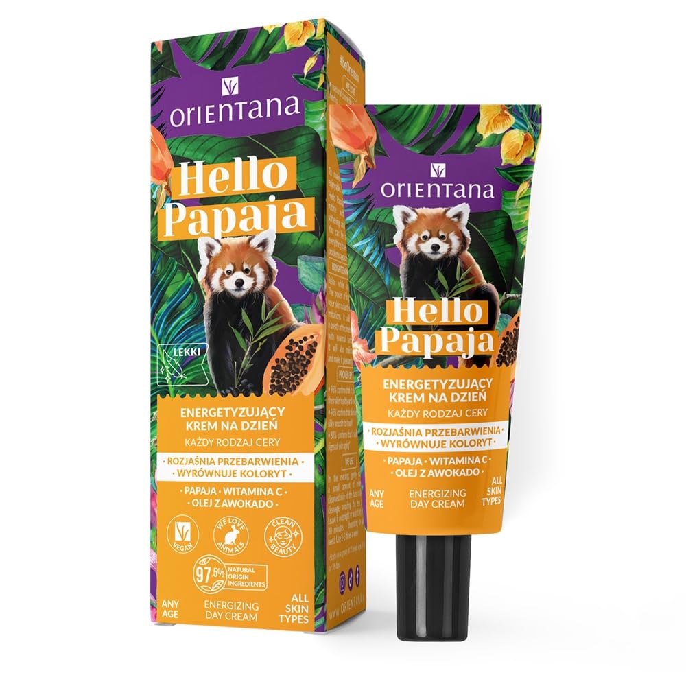 DESCRIPTION DU PRODUIT DESCRIPTION DU PRODUIT HELLO PAPAJA Energizing Day Face Cream with Vitamin C and Avocado Oil is an advanced natural cosmetic designed for daily skin care. Its light, quickly absorbing formula moisturizes, nourishes, and helps to even out skin tone and enhance radiance. Papaya extract refreshes and nourishes, giving the complexion a healthy glow. Vitamin C supports skin's youthful appearance, while avocado oil intensely moisturizes and helps regenerate the skin. Suitable for all skin types, this cream helps refresh and revitalize the skin throughout the day and works well as a makeup base. The energizing scent and light, nourishing texture make this cream a daily boost of freshness. AVERTISSEMENT DE SÉCURITÉ For external use only.Perfect for Morning Skincare Routine Ideal as a base under makeup or sunscreen, helping your skin look fresh and naturally glowing throughout the day. Skin-Softening Botanical Oils Natural Avocado Oil and plant-based emollients work together to leave your skin feeling soft, supple, and energized. Infused with Stable Vitamin C Formulated with 3-O-Ethyl Ascorbic Acid, a gentle and stable form of Vitamin C known to promote a more radiant-looking complexion. Daily Lightweight Hydration This non-greasy, fast-absorbing cream provides essential moisture without clogging pores, ideal for everyday use. Naturally Revitalizing Formula Enriched with Vitamin C, Avocado Oil, and Papaya Extract to help visibly refresh and smooth the skin's appearance.ORI?NTANA - HELLO PAPAJA Energizing day face cream Vitamin C Avocado oil, 40mlDESCRIPTION DU PRODUIT DESCRIPTION DU PRODUIT HELLO PAPAJA Energizing Day Face Cream with Vitamin C and Avocado Oil is an advanced natural cosmetic designed for daily skin care. Its light, quickly absorbing formula moisturizes, nourishes, and helps to even out skin tone and enhance radiance. Papaya extract refreshes and nourishes, giving the complexion a healthy glow. Vitamin C supports skin's youthful appearance, while avocado oil intensely moisturizes and helps regenerate the skin. Suitable for all skin types, this cream helps refresh and revitalize the skin throughout the day and works well as a makeup base. The energizing scent and light, nourishing texture make this cream a daily boost of freshness. AVERTISSEMENT DE SÉCURITÉ For external use only.Perfect for Morning Skincare Routine Ideal as a base under makeup or sunscreen, helping your skin look fresh and naturally glowing throughout the day. Skin-Softening Botanical Oils Natural Avocado Oil and plant-based emollients work together to leave your skin feeling soft, supple, and energized. Infused with Stable Vitamin C Formulated with 3-O-Ethyl Ascorbic Acid, a gentle and stable form of Vitamin C known to promote a more radiant-looking complexion. Daily Lightweight Hydration This non-greasy, fast-absorbing cream provides essential moisture without clogging pores, ideal for everyday use. Naturally Revitalizing Formula Enriched with Vitamin C, Avocado Oil, and Papaya Extract to help visibly refresh and smooth the skin's appearance.