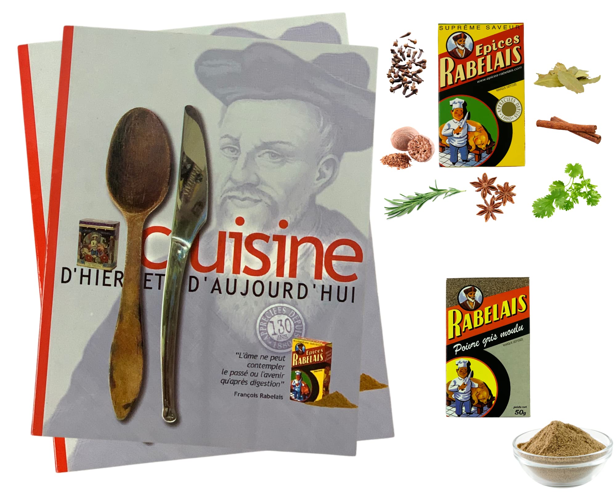 G n rique Rabelais recipe book with 1 can of Rabelais spices 50 g and 1 can of ground pepper 50 g