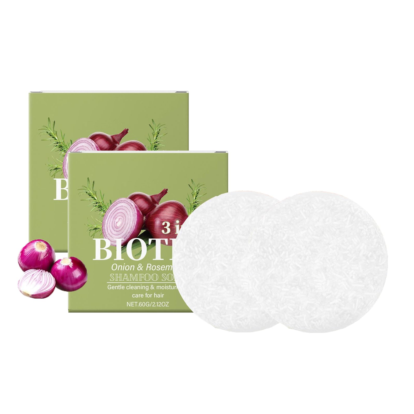 1 2 3 pc Onion Rosemary Shampoo Soap INGREDIENTS Onion Rosemary DIRECTIONS Apply to wet hair, massage to lather, then rinse thoroughly. SAFETY WARNING For external use only. Avoid contact with eyes and keep away from sources of ignition or direct heat. See morePractical size: Travel size environmentally friendly - compact, lightweight and ideal for on the go.Durable alternative to liquid shampoo. Compact travel size, ideal for on the go and space,saving storage in the bathroom. For All Hair Types: Whether for fine, thick or oily hair, this versatile shampoo is suitable for all hair types, smooths frizz, improves hair structure and ensures a neat, natural finish with every application. Hair Care Nourishment: This shampoo bar minimizes hair damage while cleansing and strands, through its soft foam texture, which reduces dryness and frizz for brighter results. Moisturizing Care: Enriched with nourishing ingredients for optimal hydration and care for all hair types. Deep Cleansing: Natural onion and rosemin formula for deep yet gentle cleansing of scalp and hair. Soothes the scalp, stimulates blood circulation and gives shine and vitality to the hair.Shampoo Bar, Onion Rosemary Shampoo Soap, Rosemary Hair Soap For Hair Care, Deep Cleansing And Hydration for All Hair Types, Travel Size (2PC)DESCRIPTION DU PRODUIT DESCRIPTION DU PRODUIT 1 2 3pc Onion Rosemary Shampoo Soap INGRÉDIENTS Onion Rosemary MODE D'EMPLOI Appliquer sur les cheveux mouillés, masser pour faire mousser, puis rincer abondamment. AVERTISSEMENT DE SÉCURITÉ For external use only. Avoid contact with eyes and keep away from sources of ignition or direct heat. Voir plusPractical size: Travel size environmentally friendly - compact, lightweight and ideal for on the go.Durable alternative to liquid shampoo. Compact travel size, ideal for on the go and space,saving storage in the bathroom. For All Hair Types: Whether for fine, thick or oily hair, this versatile shampoo is suitable for all hair types, smooths frizz, improves hair structure and ensures a neat, natural finish with every application. Hair Care Nourishment: This shampoo bar minimizes hair damage while cleansing and strands, through its soft foam texture, which reduces dryness and frizz for brighter results. Moisturizing Care: Enriched with nourishing ingredients for optimal hydration and care for all hair types. Deep Cleansing: Natural onion and rosemin formula for deep yet gentle cleansing of scalp and hair. Soothes the scalp, stimulates blood circulation and gives shine and vitality to the hair.