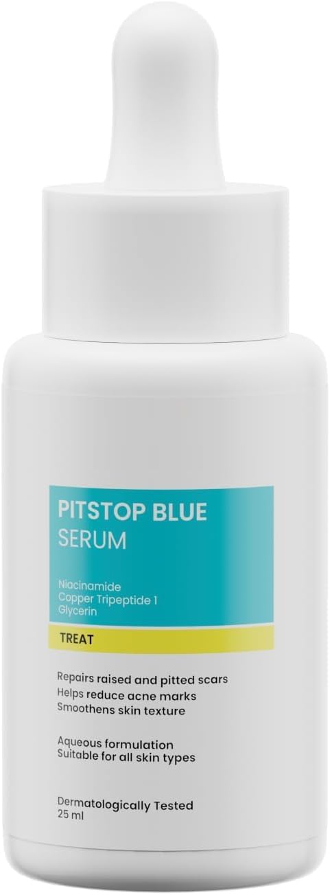 DESCRIPTION DU PRODUIT Pitstop Blue Copper Peptide Serum, Repairs Acné Scars Pitted Marks, Evens Skin Tone Reduces Blemishes, For All Skin Types, 25 Mhz l