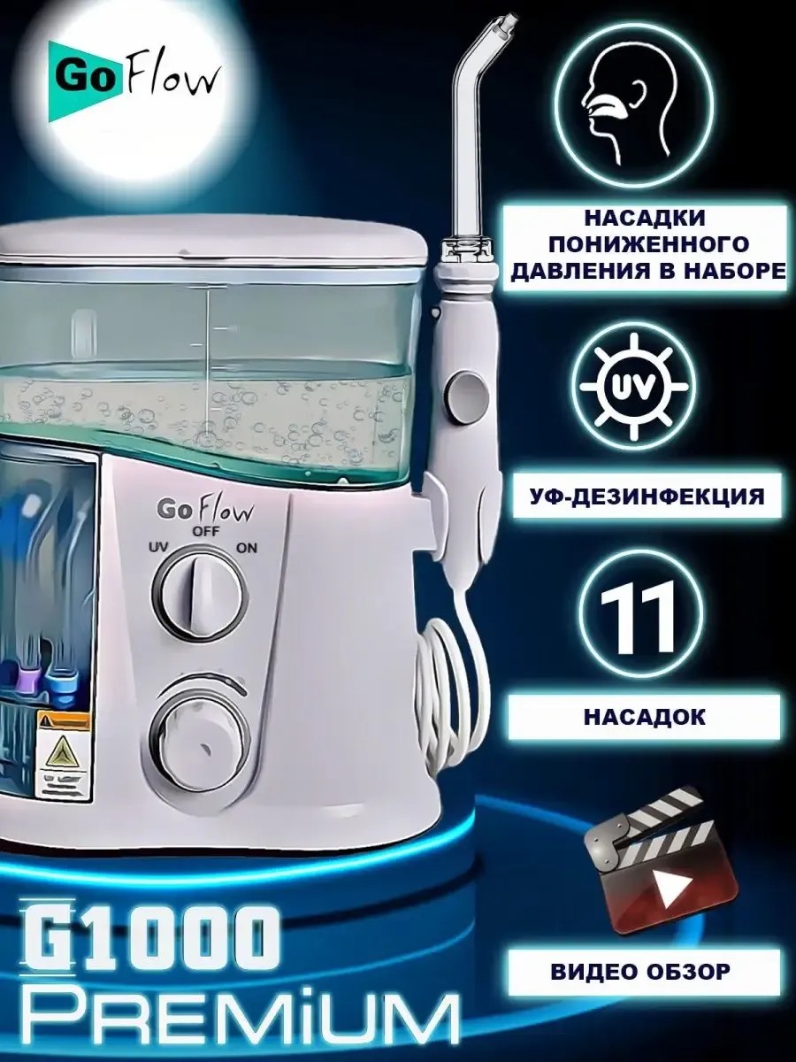 Премиальный Ирригатор GoFlow G1000 /Кварцевый обеззараживатель/11 насадок в т.ч. 2 низкого давления!/Диапазон чистки 20! - 890кПа/Бачок-1000мл/ПРЕМИАЛЬНАЯ ГАРАНТИЯ (любой выявленный дефект в течение года, и мы пришлем Вам новый ирригатор к вашему дому. Все Бесплатно. Никакого ремонта. Только новые приборы. Электронное гарантийное обращение) Лучший сервис для Вас! ……………………………………………………………….…………………………………… Ирригатор стационарный для всей семьи с бачком 1000мл. и 11 насадками. Назальная насадка подойдет для промывания носа, что сокращает вероятность респираторных заболеваний в 7 раз. Насадка низкого давления, формирующая широкую чистящую струю, пригодится для особо чувствительных зон. Ирригатор для зубов профессиональный, мощным давлением удалит 99,9% бактериального налета с поверхности зубов и десны. Зубные щетки и ирригаторы необходимы всем на ежедневной основе. Ирригатор для зубов стационарный - профессионально очищает ротовую полость давлением пульсирующей струи воды. + Массаж десны для оздоровления и укрепление тканей пародонта (нет кровоточивости и воспаления десны). Уход за полостью рта, очищение брекетов, имплантов, мостов и коронок, а также межзубных промежутков, десневого кармана и других мест недоступных зубной щетке. Профилактика многих заболеваний ротовой полости и десны. Красота и здоровье станут Вашими постоянными спутниками! ……………………………………………………………….…………………………………… СИЛЬНЫЕ СТОРОНЫ МОДЕЛИ: Насадки всегда стерильны благодаря кварцевому обеззараживателю; Ирригатор зубной рассчитан на всю семью (мощные исполнительные механизмы, выдерживающие большие нагрузки годами); Самый широкий диапазон давления чистящей струи из ирригаторов; Насадка низкого давления с мягким и широким соплом поможет смыть бактериальный налет с чувствительных зон (например пробки с миндалин); 11 насадок в наборе на любой жизненный случай; Ножки присоски не дадут прибору опрокинуться и обеспечат гашение вибрации; Надежная защита от влаги и Высокое качество материалов