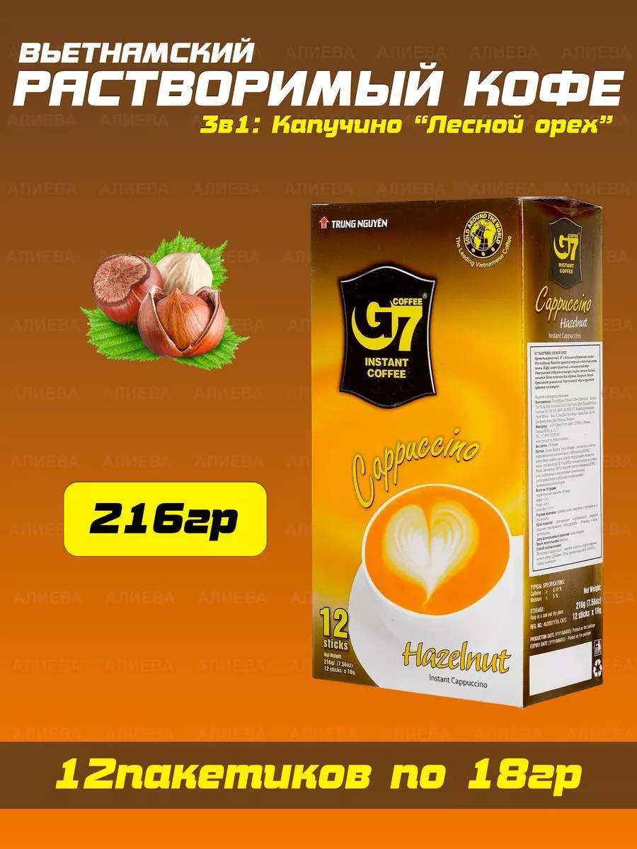 Для вашего удобства, в данной карточке вы можете приобрести : Trung Nguyen G7 Cappuccino Мокка , Cappuccino Hazelnut . Ароматизированный кофе Trung Nguyen G7 Cappuccino Мокка с большим содержанием сливок, идеально подходит для создания богатого аромата капучино с толстым слоем пенки. Этот растворимый кофе имеет приятный и ненавязчивый вкус. Уменьшенное содержание сахара и жиров, делает данный напиток более полезным для здоровья. Trung Nguyen G7 Cappuccino со вкусом Мокка обладает приятными нотками какао во вкусе.Cappuccino Hazelnut -быстрая альтернатива любимому многим капучино с нежной пенкой и мягким ароматом лесного ореха.Вьетнамский кофе давно прославился на весь мир благодаря своему необычному вкусу и пленяющему аромату. Многие, кто пробовали этот напиток, отмечают его необыкновенность и оригинальный, не похожий на другие, вкус. И это неудивительно, так как кофе у многих людей ассоциируется именно с Вьетнамом, откройте для себя насыщенный вкус настоящего кофе из Вьетнама!