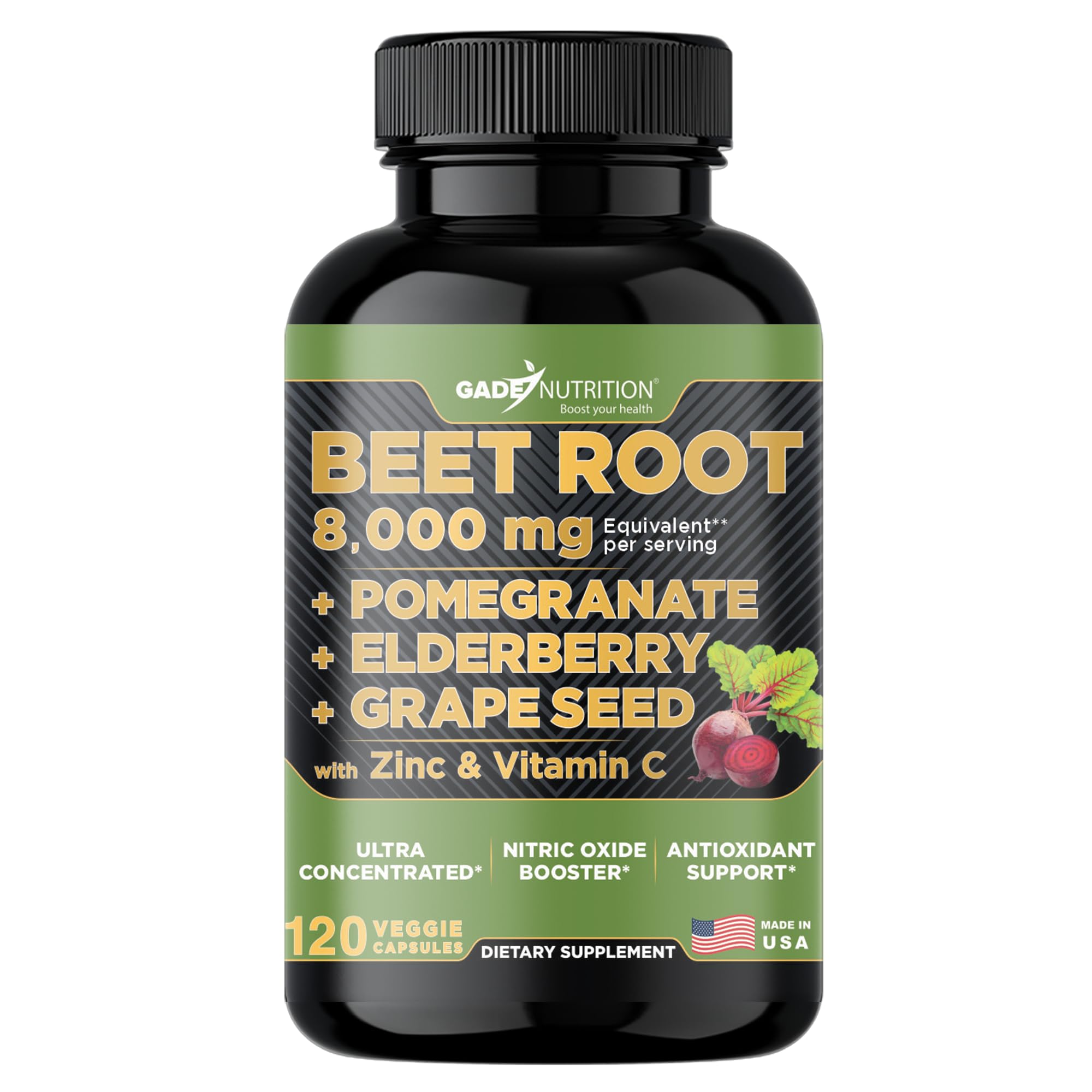 fiber, iron, potassium, calcium, and magnesium to fill in the gaps in your diet for whole nourishment and super results. EXTRA STRENGTH FORMULA: Gade Nutrition Beet Root capsules naturally contain beneficial nitrates that boost nitric oxide levels and improve overall circulation and blood flow. Our supplement is enriched with Sambucus Elderberry, Pomegranate, Grape Seed powder, Vitamin C, Vitamin A and Zinc. It’s a powerful compound to promote heart health, improve cognitive function, improve performance, and boost overall good health and well-being.