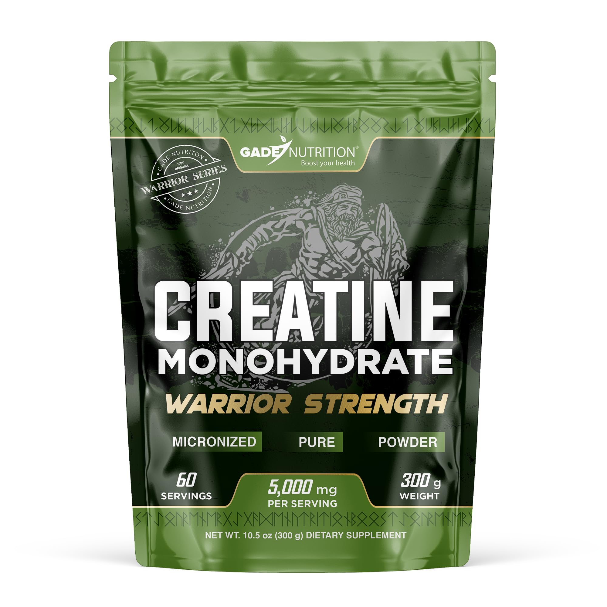 Built for every kind of athlete: Whether you're a woman training to build strength, a beginner learning to lift, or a competitive athlete pushing your limits — creatine is for you. Warrior Strength is made in the USA under strict GMP standards, third-party tested for purity, and trusted by real people who train with purpose. This isn't hype. It's high-performance fuel, designed to move you forward. Stack it your way, flavor-free: No taste. No fillers. No surprises. Just pure creatine powder that blends easily into any liquid. Perfect for pre-workout, post-workout, or stacked with your favorite amino acids. Free from gluten, GMOs, and artificial junk, it's the perfect choice for athletes who want performance without compromise. Cleaner than gummies, smarter than capsules: Gummies and pills often come with added sugars, coatings, and minimal dosing. Our unflavored creatine powder gives you full flexibility to mix, stack, and dose your way. Whether you're looking for creatine gummies for women, creatine capsules, or creapure creatine, Warrior Strength offers the same benefits in a cleaner, more adaptable form. 60 full servings, zero fluff: This 300g pouch delivers 60 complete servings of unflavored, lab-tested creatine monohydrate. It's a solid option for short-term training cycles, travel, or for those just starting their creatine journey. While others sell underdosed capsules or overpriced gummies, Gade gives you clean, straightforward strength. Because real athletes don't settle for "trendy", they choose what performs. Power that builds from the first scoop: Packed with 5,000mg of pure creatine monohydrate per serving, Warrior Strength is designed for real results, no shortcuts. Whether you're aiming to increase strength, boost endurance, or support lean muscle development, this powder is a proven ally for serious athletes and everyday grinders alike. Creatine remains one of the most researched and reliable supplements for a reason: it works. And we deliver it without compromise.