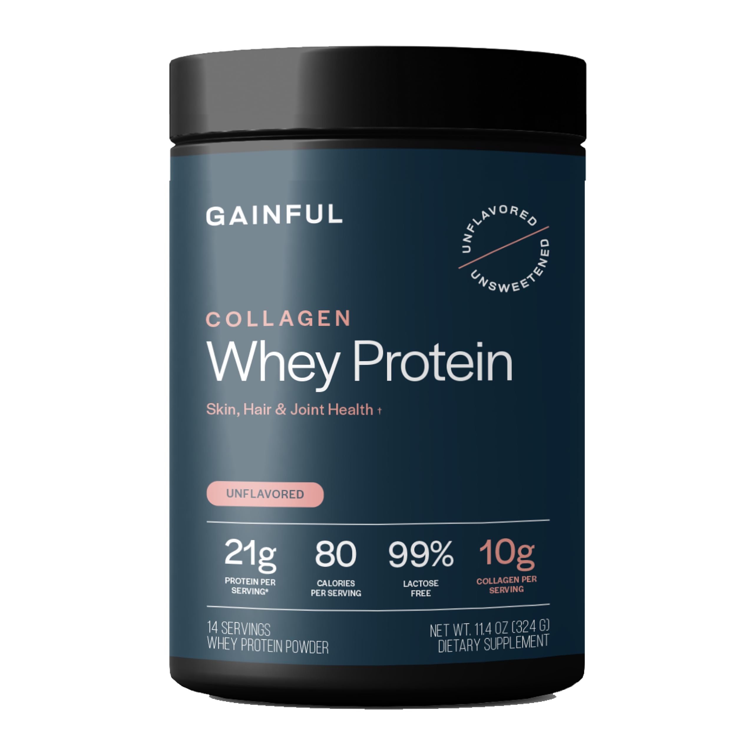 CUSTOMIZABLE FLAVOR WITH CLEAN INGREDIENTS: Unflavored for maximum versatility—no artificial flavors, sweeteners, or dyes. Pair with Gainful Flavor Packets to change your flavor daily without compromising nutrition. HOW TO USE: Mix 1 scoop with 8–12 oz of milk or your preferred beverage. Add a Gainful Flavor Packet if desired, shake vigorously, and enjoy. Also great in smoothies or recipes. GUT-FRIENDLY, CLEAN PROTEIN FORMULA: Virtually lactose-free and easy to digest with just 80 calories per serving, delivering clean, powerful protein without bloating or discomfort. HELPS PROMOTE JOINT AND SKIN HEALTH: Rich in collagen peptides and vitamin C, formulated to nourish joints, improve skin elasticity, and promote overall mobility and recovery. SUPPORTS MUSCLE RECOVERY AND FULL-BODY HEALTH: Combines whey protein isolate and grass-fed collagen peptides to help rebuild muscles and support joints, skin, and connective tissues.