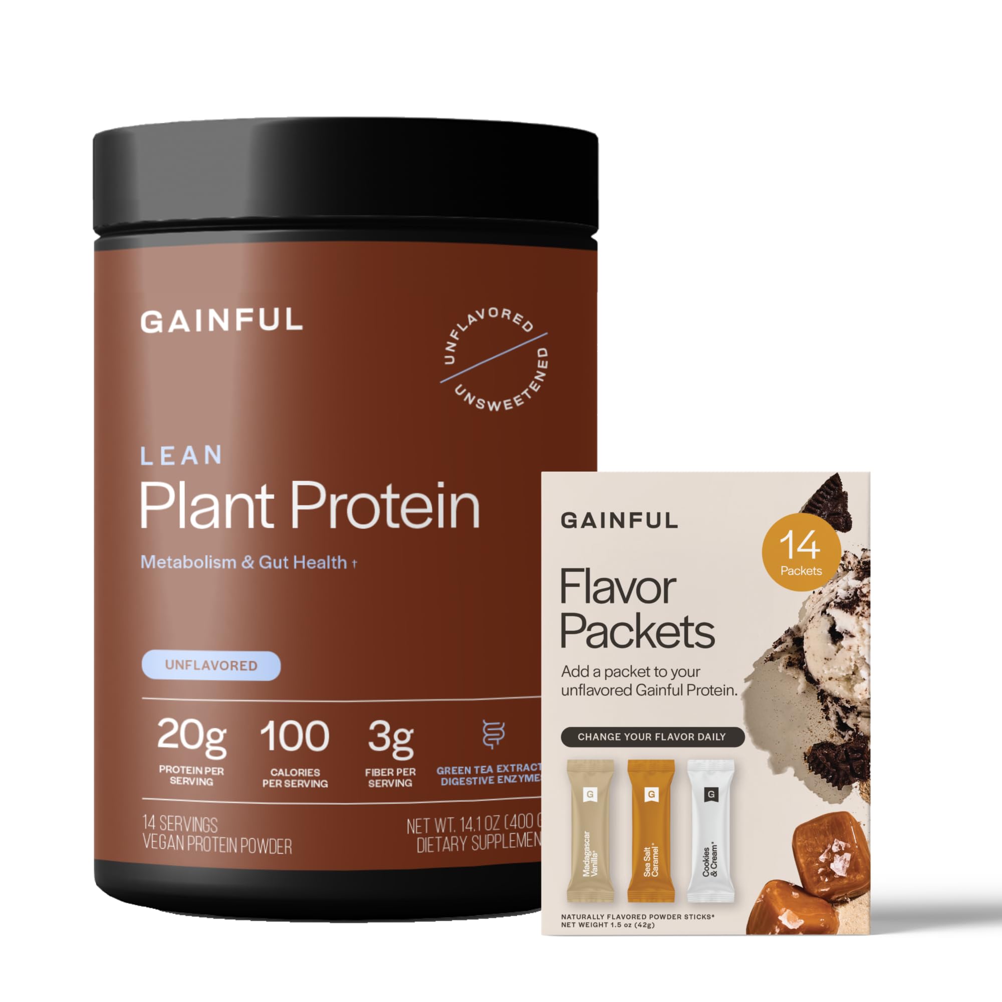 Gainful Lean Plant Protein Powder & Sweet Treat Flavor Bundle 20g Plant Protein Supports Lean Muscle Metabolism & Satiety with Green Tea Extract Vegan 14 Servings + 14 Flavor Sticks