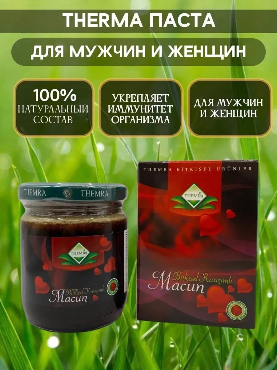 Травяная паста Therma Original — натуральный продукт из Турции, созданный на основе цветочного мёда, маточного молочка, пчелиной пыльцы и комплекса растений (горный шалфей, гинкго билоба, рожковое дерево, овёс, имбирь и др.).
