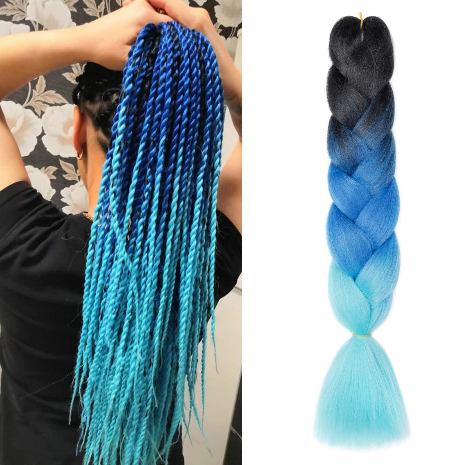 Gairyan Jumbo Braids Extensions Flechten Kunsthaar zum Einflechten Haar 1 Stück 100g Braiding Hair 60cm Ombre Synthetik Zöpfe Afro Hair für Box Crochet Braids (Schwarz Saphir Himmelblau) 60 cm (1 Stück) Schwarz Saphir Himmelblau