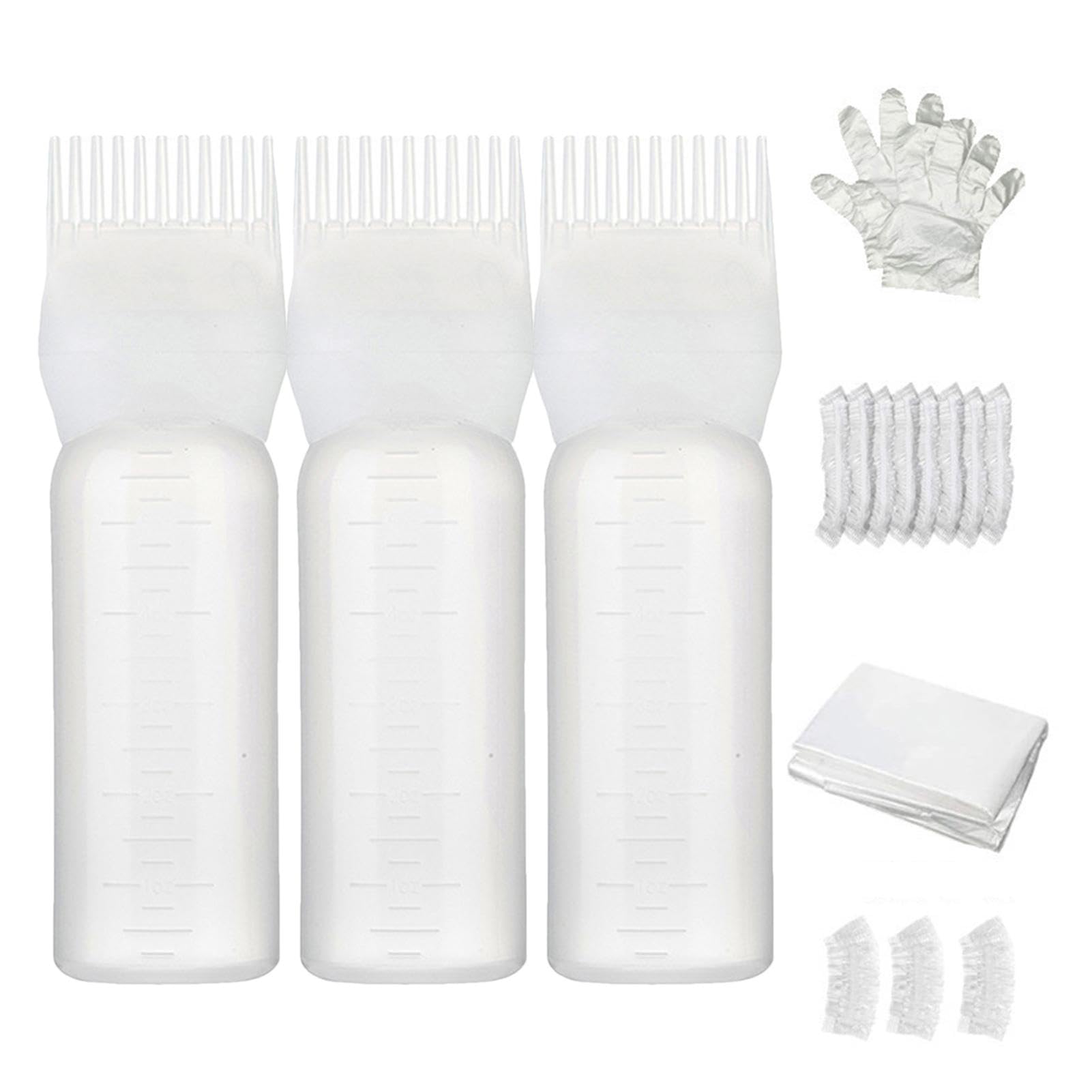 ? ??Multi-Functional Design?In addition to hair dye and care oils, our hair oil applicator bottle can be used for aromatherapy oils, hair care products, and more. The wide range of applications makes it perfect for use in salons and homes, as well as a cleaning and shampoo bottle. ? ??Easy to Use?Just fill the dye bottle with your pre-mixed hair color and use the pump action handle to get the dye flowing through the comb head, won't stick your hands when you applying. ? ??Appropriate Size?Thee bottle long is approx 17cm, width: 4.5cm, suitable size will give you a more even distribution of color where you want it and you will get more even distribution of color on your hair, perfect for you to use in your home or salon. ? ??Precise scale design?The root comb applicator bottle has precise scales, which is convenient for you to understand the usage ratio and remaining capacity when using it. The root comb oiler bottle is soft and easy to squeeze for easy control. The set also comes with gloves*10, shower caps*5, earmuffs*10, and apron*1. ? ??Premium Material?Root comb applicator bottle is made of ABS material, which is not easy to break, lightweight and easy to carry, and also washable and reusable.