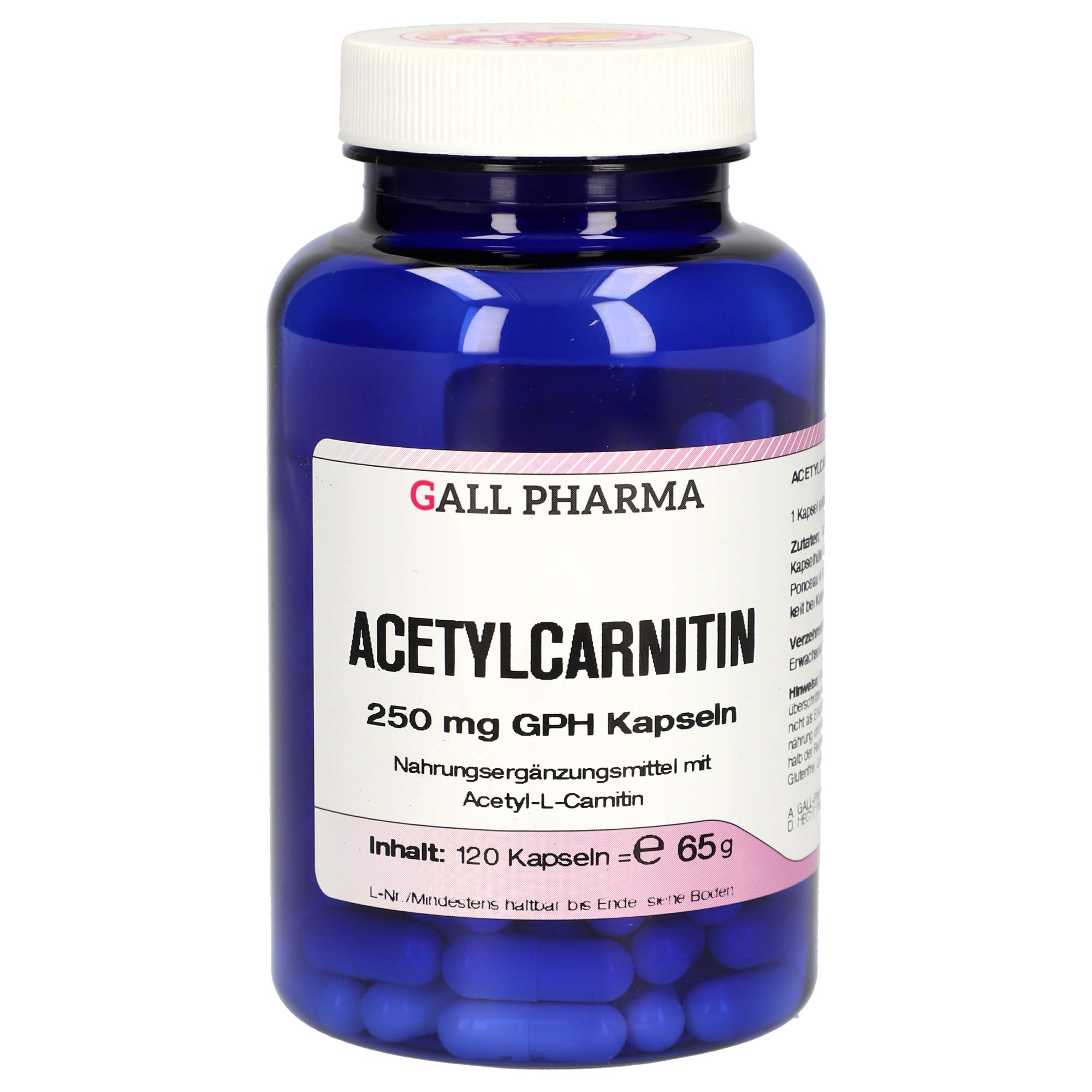 Acetylcarnitin 250 mg GPH capsules Acetylcarnitin 250 mg GPH capsules contain 250 mg o-acetyl-l carnitin in a hard gelatin capsule.This natural substance plays a special role in the energy metabolism of brain and nerve cells.O-acetyl-l carnitin has cholinergic effects and can affect cognitive functions (memory performance) and age-related functional restrictions in the brain.O-acetyl-l carnitine is food for brain and nerves.-Acetyl-L carnitin increases the formation of acetylcholine in the brain-Acetyl-L carnitine has cholinergic properties and plays a role in the parasympathetic nervous system-acetyl-l-carnitine serves as a quick-available energy reservoir-acetyl-l carnitine is important for theSpermia motility-Acetyl-L-carnitine plays a vital role for male fertility and fertility consumption recommendation: 1 capsule daily with fluid notes: gluten-free.Lactose -free.More products: Acetylcarnitin 500 mg GPH capsules Ingredients ingredients Acetyl-l-carnitine HCL (45 ), filler: Mannitol, capsule shell: gelatin, dyes: titanium dioxide, iron oxide, ponceau 4 R, quinol ringing (can affect activity and attention in children!), Patent blue V