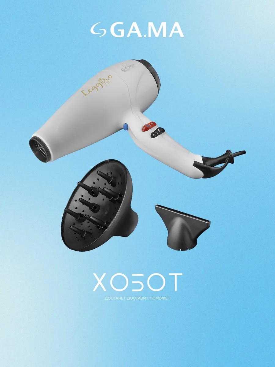 Main characteristics. Type: hair dryer. Power: 2100 W. Motor type: AC motor. Control. Control: push-button. Number of speeds: 2. Number of heating modes: 3. Independent heat and air flow control: yes. Control buttons located on the side. Nozzles. Number of nozzles: 2. Concentrator nozzle: yes. Diffuser nozzle: yes. Additional characteristics. Cool air blowing: yes. Ionization: yes. Removable filter: yes. Hanging loop: yes. Color and material. Color: white. Body material: plastic. Protective grill material: plastic. Power supply. Power cord length: 3 m. Package contents. Instructions: yes. Dimensions and weight. Weight: 0.582 kg.