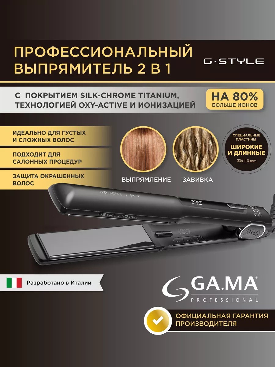 Ga. Ma - official store. This hair straightener, equipped with Oxy-Active and IHT technologies, allows you to achieve a color-preserving effect, meaning longer-lasting color and enhanced shine. This hair straightener achieves this effect through the combined action of active oxygen, which provides deep cleansing and increased oxygenation of the scalp, and ions, which restore the hair's surface, eliminate static electricity, and make hair soft and shiny. This professional hair straightener with IHT technology allows you to achieve perfectly smooth hair in one stroke: the time of heat exposure to the hair is reduced thanks to the uniform and constant heating of the extended length and width heating plates (33 mm x 110 mm). The new generation Silk Chrome Titanium mirror heating plates glide perfectly through your hair. This professional hair straightener with an auto-off function after 60 minutes of use allows you to straighten and curl your hair. A straightener with a 3-meter cable will make the professional's job easier. br