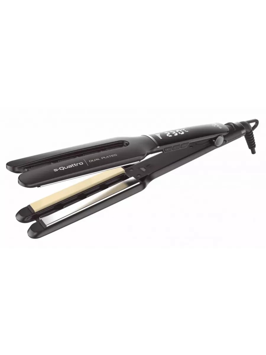 S-QUATTRO DUAL PLATES, выпрямитель для волос с 4 узким и длинным плавающим пластинам 1,4 x 11 см: две из них покрыты полированным титаном, а две другие керамикой с добавлением эфирных масел. Титан является отличным проводником тепла, сохраняя постоянную температуру на каждом этапе укладки. Керамика, обогащенная эфирными маслами, обеспечивает легкое и нежное скольжение по волосам, глубоко питая волосы и защищая их естественную влажность. Благодаря системе быстрого нагрева Quick Heat выпрямитель готов к работе менее, чем через 30 секунд . Выпрямление волос станет легким и приятным благодаря регулируемой температуре от 140 до 230°(с шагом 10°C ), вращающемуся на 360° длинному шнуру 2,5 метра, четырем плавающим пластинам и сверхтонкому утонченному дизайну. Основой безопасности использования является функция автоматического отключения, которая активируется через 60 минут бездействия. Прибор подходит даже для густых и объемных волос. Для удобства использования есть кнопка блокировки пластин в сложенном состоянии. Автовольтаж (диапазон напряжения 110-240 В ~) позволяет использовать прибор даже за границей. Вес прибора всего 248 грамм.