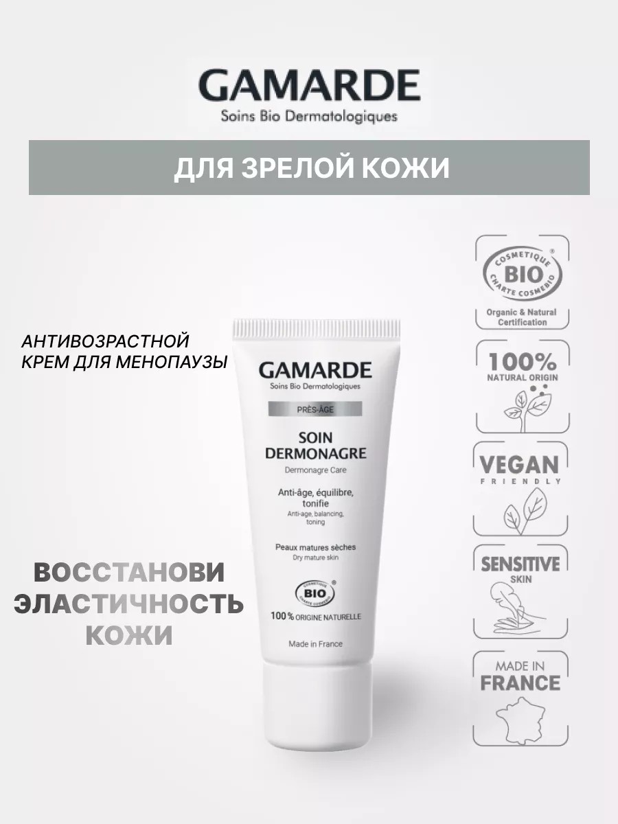 Лаборатория Гамард разработала антивозрастной Крем с примулой специально для сухой зрелой кожи с учетом особых потребностей эпидермиса в период менопаузы или гормонального старения. Натуральная формула на основе термальной воды Гамард, ценных масел примулы и огуречника обеспечивает питание кожи, препятствует потере влаги и помогает бороться с признаками старения. При регулярном применении Gamarde Près-Age Soin Dermonagre кожа становится тонизированной, мягкой и эластичной, лицо приобретает свежесть и сияние. Универсальное средство походит для кожи лица, контура и губ.