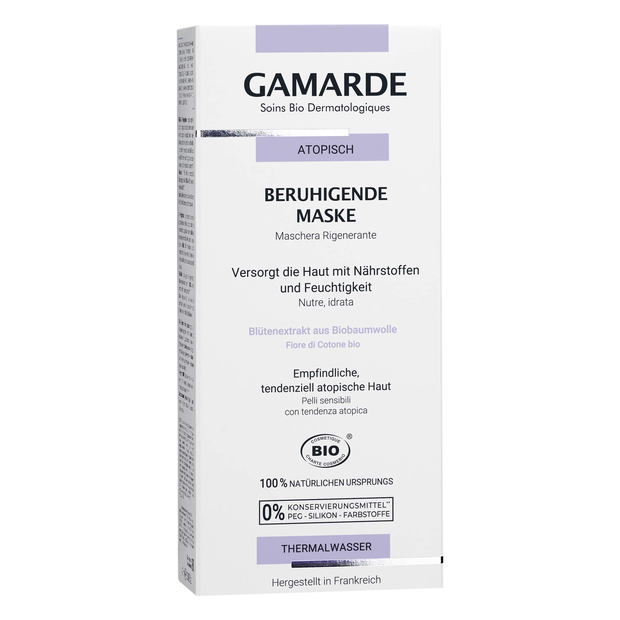 The unique connection between water from the Gamarde-Les-Bains thermal spring and argan oil provides comfort and efficiency for sensitive skin. We want to show you the immense potential there is in nature and plants. That is why Gamarde Dermatological Laboratoires has developed an original range of certified organic cosmetics products. The Gamard care series is free from chemical ingredients and therefore suitable for sensitive skin.GAMARDE: Natural care from nature! GARMARDE has developed an original range of certified organic cosmetic products – Made in France!. Use: Use the natural organic cosmetic care product 1 to 2 times a week. Leave on for 10 minutes and remove with cotton wool. Ingredients: Our hypoallergenic facial mask contains mirabilis extract, cotton blossom extract, shea butter, Gamarde thermal water and nourishing sweet almond oil from organic cultivation (completely fragrance-free). High-quality organic cosmetics: 100 natural! Our organic care range is free from chemical ingredients, preservatives, PEG, silicone and dyes. Our care products have not been tested on animals. For naturally beautiful skin. Atopic care: The dermatologically tested natural cosmetic beauty mask soothes damaged skin, which is prone to atopic dermatitis. High-quality ingredients of the moisture mask nourish dry, sensitive skin and make it supple.GAMARDE Biologische cosmetica: kalmerend masker, hypoallergeen, masker voor de gevoelige huid, natuurlijke cosmetica, voedend gezichtsmasker, gezichtsmasker voor mannen en vrouwen, veganistisch, 40 ml De unieke verbinding tussen water uit de thermische bron Gamarde-Les-Bains en arganolie biedt comfort en efficiëntie voor de gevoelige huid. Wij willen je laten zien welk immense potentieel er in natuur en planten zit. Daarom heeft Gamarde Dermatological Laboratoires een origineel assortiment gecertificeerde biologische cosmeticaproducten ontwikkeld. De Gamard-verzorgingsserie is vrij van chemische ingrediënten en dus geschikt voor de gevoelige huid.GAMARDE: De natuurlijke verzorging uit de natuur! GARMARDE heeft een origineel assortiment gecertificeerde biologische cosmeticaproducten ontwikkeld – Made in France!. Gebruik: het natuurlijke biologische cosmetica-verzorgingsproduct 1 tot 2 keer per week gebruiken. 10 minuten laten inwerken en met watten verwijderen. Ingrediënten: ons hypoallergene gezichtsmasker bevat mirabilis-extract, katoenbloesemextract, sheaboter, Gamarde thermisch water en voedende zoete amandelolie uit biologische teelt (volledig vrij van geurstoffen). Hoogwaardige biologische cosmetica: 100 natuurlijk! Onze biologische verzorgingsserie is vrij van chemische ingrediënten, conserveringsmiddelen, PEG, siliconen en kleurstoffen. Onze verzorgingsproducten zijn niet getest op dieren. Voor een natuurlijk mooie huid. Atopische verzorging: het dermatologisch geteste natuurlijke cosmetica beauty-masker kalmeert de beschadigde huid, die gevoelig is voor atopische dermatitis. Hoogwaardige ingrediënten van het vochtmasker voeden een droge, gevoelige huid en maken het soepel.