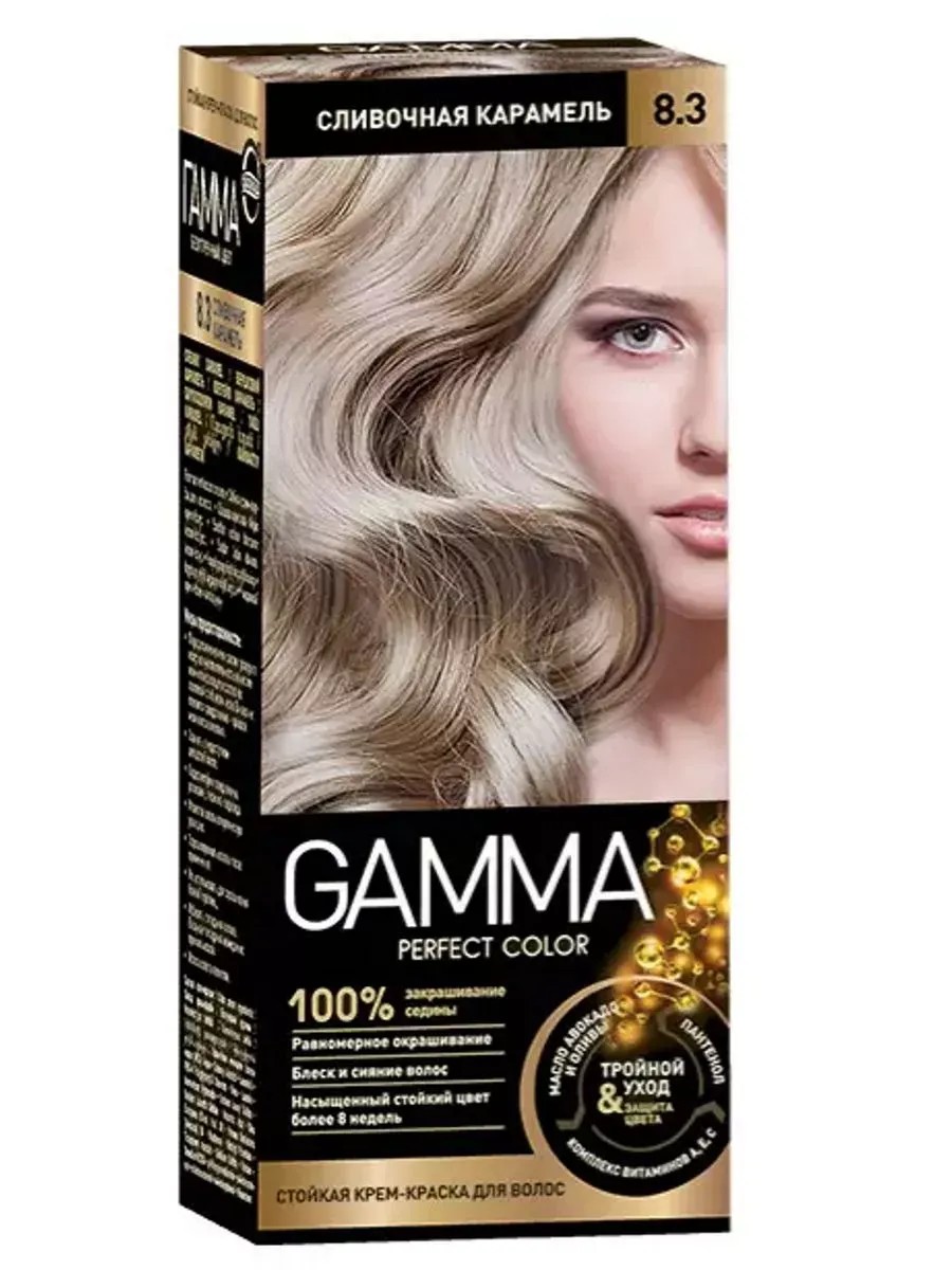 Стойкая крем-краска для волос Gamma 8.3 Сливочная карамель предназначена для окрашивания волос в натуральные и яркие оттенки. Формула крем-краски Gamma содержит природные компоненты - растительные масла, карбамид и ланолин - которые питают, смягчают и предотвращают сухость волос в процессе окрашивания.