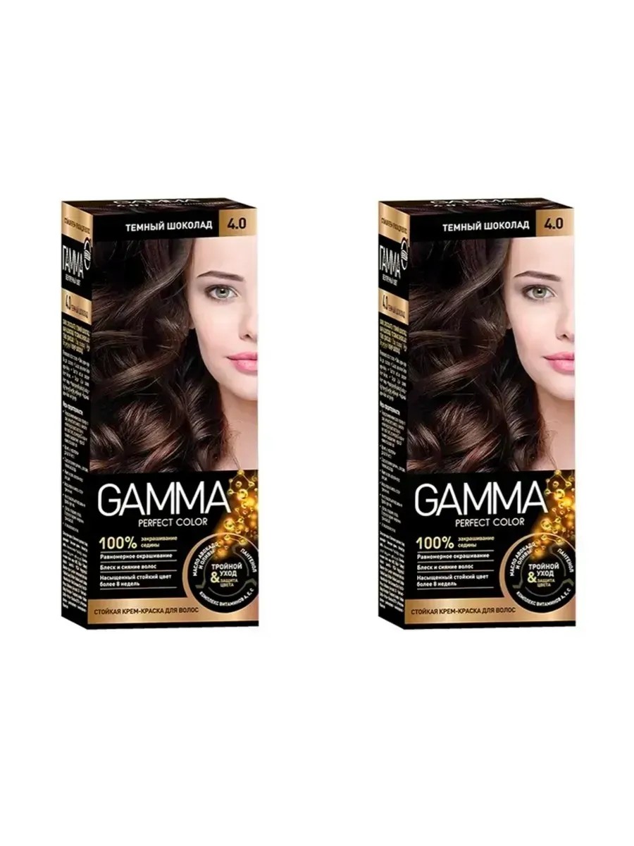 Gamma Крем-краска для волос Perfect Color тон 4.0 Темный шоколад, 50 мл, 2 упаковки в комплекте. Стойкая крем-краска для волос Gamma предназначена для окрашивания волос в натуральные и яркие оттенки. Формула содержит природные компоненты, которые питают, смягчают и предотвращают сухость волос.