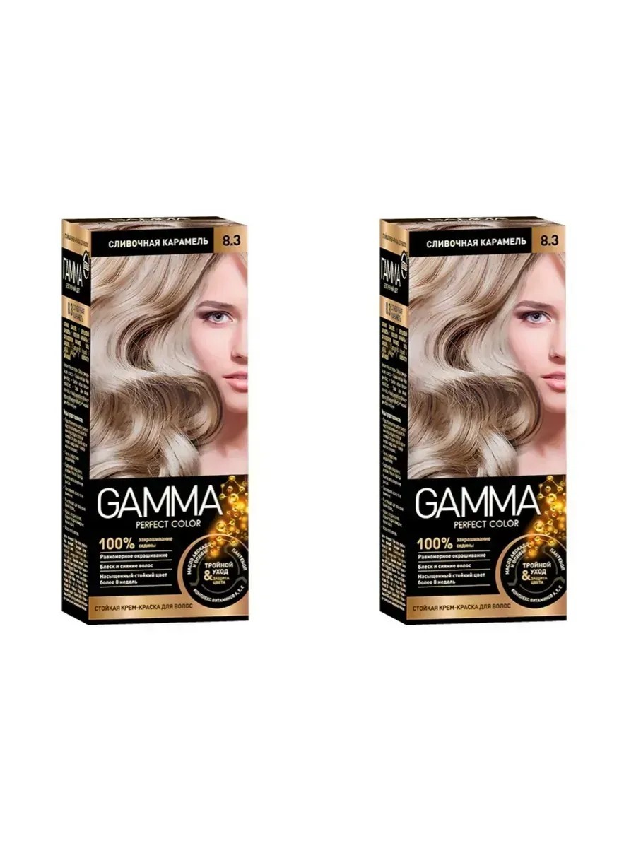 Gamma Крем-краска для волос Perfect Color тон 8.3 Сливочная карамель, 50 мл, 2 упаковки в комплекте. Стойкая крем-краска для волос Gamma предназначена для окрашивания волос в натуральные и яркие оттенки. Формула содержит природные компоненты, которые питают, смягчают и предотвращают сухость волос.