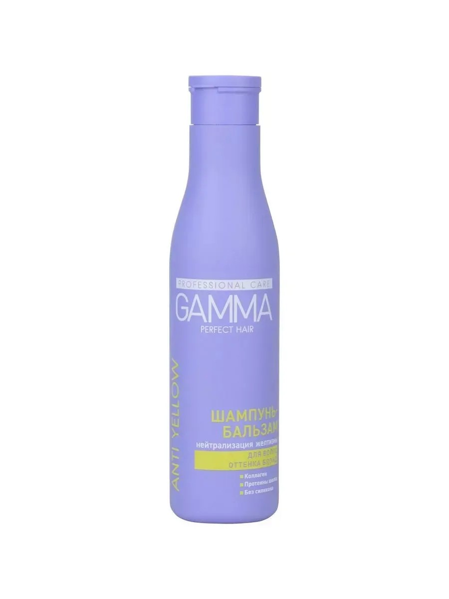 Шампунь-бальзам Gamma Perfect Hair 2в1 для волос оттенка блонд, 250 мл. Многие блондинки сталкиваются с проблемой желтизны и рыжих оттенков на волосах. Наша профессионально разработанная формула шампуня поможет полностью забыть об этой проблеме! Входящий в состав фиолетовый пигмент мгновенно нейтрализует жёлтые оттенки, сохраняя изысканный холодный оттенок на волосах. Коллаген уплотняет волосы, делает их более сильными и упругими. Протеины шелка, витамины А и Е придают волосам блеск и шелковистость, способствуют их росту и восстановлению.