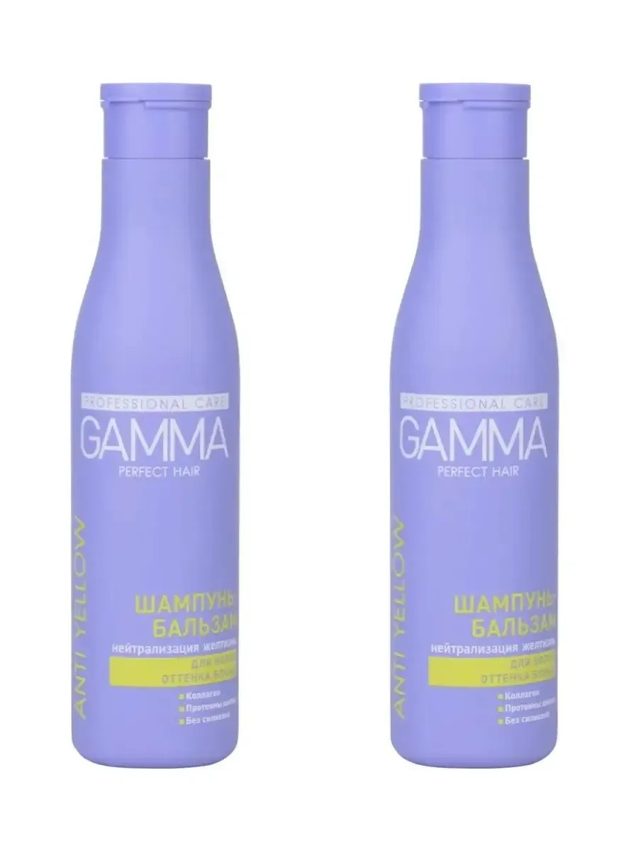 Gamma, Perfect Hair, шампунь-бальзам 2в1, для волос оттенка блонд, 250 мл. Многие блондинки сталкиваются с проблемой желтизны и рыжих оттенков на волосах. Разработанная формула шампуня поможет полностью забыть об этой проблеме! Входящий в состав фиолетовый пигмент мгновенно нейтрализует жёлтые оттенки, сохраняя изысканный холодный оттенок на волосах. Коллаген уплотняет волосы, делает их более сильными и упругими. Протеины шелка, витамины А и Е придают волосам блеск и шелковистость, способствуют их росту и восстановлению. В комплекте 2 штуки по 250 мл.