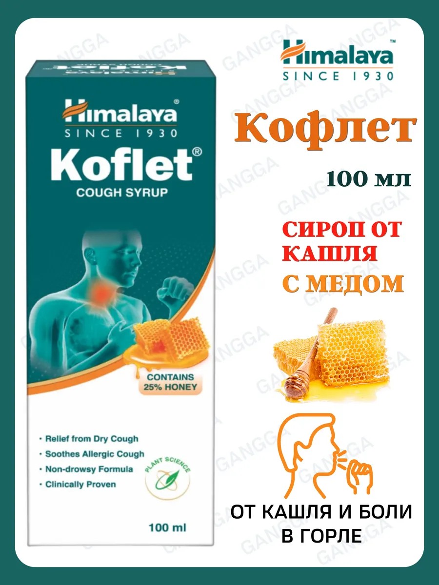 Кофлет Хималая (сироп от кашля) Koflet Himalaya 100 мл. Это многокомпонентный аюрведический чисто растительный препарат в форме сиропа для борьбы с симптомами респираторных заболеваний: сухим и влажным кашлем любого происхождения, в том числе кашлем курильщика или кашлем при ХОБЛ, бронхите, пневмонии, ларингите, фарингите, астме. Это густая жидкость коричневого цвета, сладкого вкуса, с характерным запахом. Сироп хорошо снижает вязкость бронхиального секрета, облегчает отхаркивание, выводит мокроту, снижает раздражение слизистой, снимает бронхиальный спазм. Приносит облегчение при кашле, особенно при затяжном, уменьшает боль, зуд и першение в горле. Сироп обладает противомикробным свойством, поддерживает иммунитет. В составе средства – эффективные ингредиенты, обладающие антисептическим, противовоспалительным действием: гуггул, базилик священный, солодка, адатода, а также известные формулы трифала и трикату, способствующие очищению и выведению шлаков и слизи. Мед успокаивает раздражение, боль в горле. Способ употребления: детям 3-12 лет: по 2,5-5 мл 3 раза в день. Взрослым и детям старше 12 лет: по 5-10 мл (по 1-2 чайные ложки) 3-4 раза в день за полчаса до еды курсом 10-15 дней, после перерыва курс можно повторить. Противопоказания: индивидуальная непереносимость ингредиентов; беременность, лактация; сахарный диабет (содержит мед). Возможны проявления аллергии. Не является лекарственным средством. Перед началом приема препарата рекомендуем проконсультироваться со специалистом по Аюрведе для назначения индивидуально необходимой схемы.