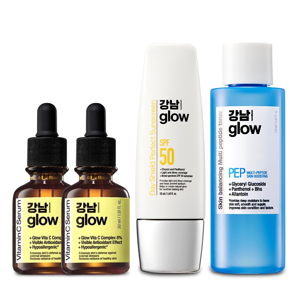 Reveal Your Glow with Multi-Peptide Power: Experience the remarkable effects of our toner, enriched with advanced 8 multi peptides and BHA (salicylic acid), addressing your skin's every need from soothing to hydrating, exfoliating, and enhancing your natural glow. Unlock the Magic of a 3-Day Skin Transformation : Experience radiant skin with our high-concentration Vitamin C formula, enriched with hyaluronic acid for ultimate moisturization. Light Silky Texture: Lightweight, fast-absorbing texture glides smoothly onto the skin, leaving a healthy glow. Non-greasy, sheer formula doesn't leave any residue. ? Sun Protection and Skin Tone-Up: Experience powerful sun protection (SPF50 Broad Spectrum) combined with a natural tone correction formula, providing a dewy base for glowing skin all day. ?The Secret to Natural Radiance with GANGNAM GLOW : Harnessing advanced technology, our skincare products promote healthy, glowing skin. Dedicatedly formulated for sensitive skin, our formulas come with clinically proven benefits.