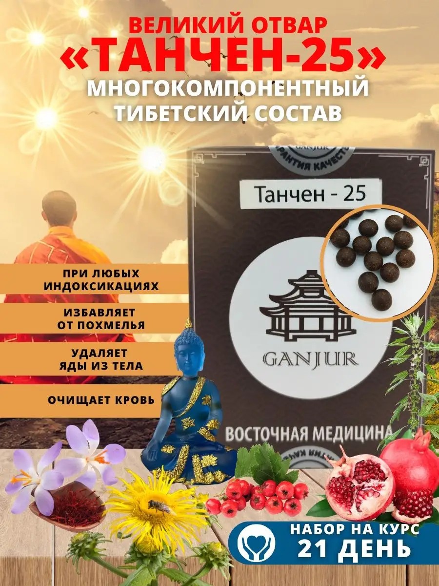 Действие с точки зрения тибетской медицины: Регулирует (выравнивает) 3 конституции, лечит болезни Смуг-по, отравления. Собирает Жар в одно место и устраняет его. Танчен 25 является препаратом выбора при смешанных конституциях и сложных, запущенных заболеваниях, а также тогда, когда трудно уточнить что преобладает: жар или холод. Показания: снижение иммунитета; панкреатит; зоб; хроническая язвенная болезнь