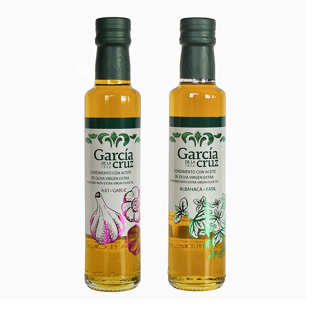 GARCÍA DE LA CRUZ - Huile d'olive vierge extra, coffret cadeau, huile aromatisée, basilic et ail, d'Espagne, Montes de Toledo, bouteilles en verre, lot de 2 - 250 ml