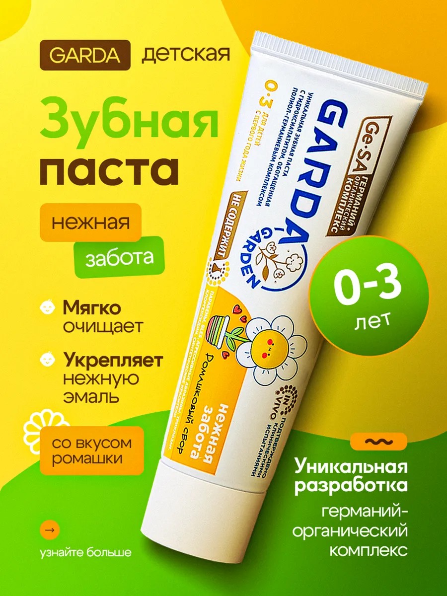 Первые зубки требуют особенного ухода, и Garda Garden «Нежная забота» создана именно для этого! Подходит для малышей с первого года жизни и обеспечивает бережную защиту от кариеса, не повреждая тонкую эмаль.