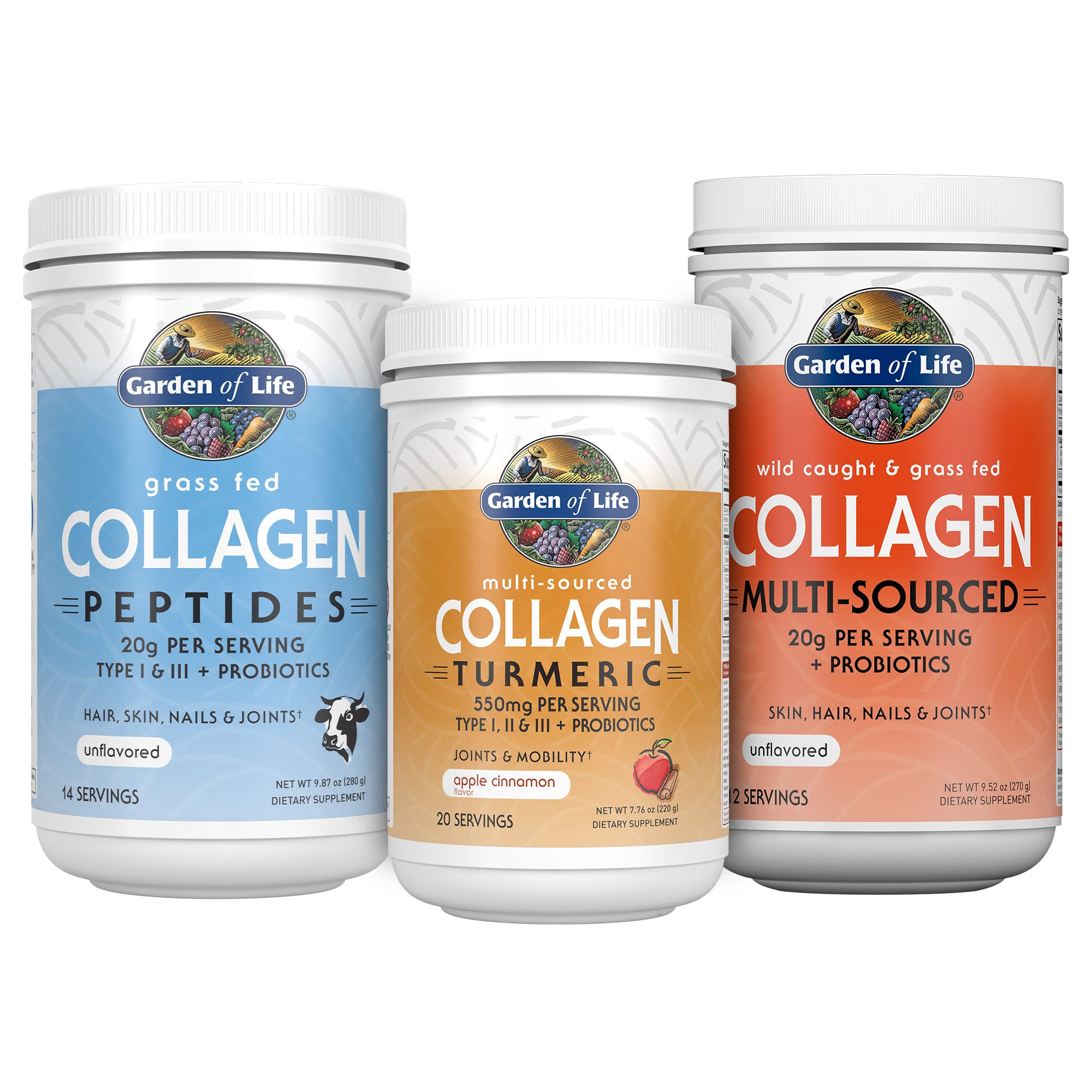 Garden of Life Collagen Bundle: Grass Fed Peptides Unflavored 14 Servings + Collagen Turmeric Apple Cinnamon 20 Servings + Multi-Sourced Collagen Unflavored Powder 12 Scoops Hair Skin Nails Joints