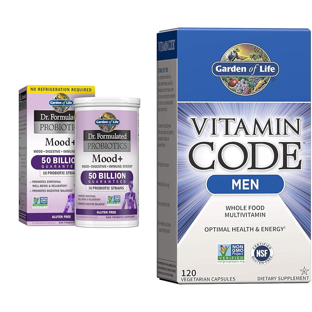 Garden of Life Dr. Formulated Probiotics Mood Acidophilus Probiotic Supplement - Promotes Emotional Well-Being, Relaxation and Digestive Balance - Ashwagandha for Stress Management, 60 Veggie Caps Dr. Formulated Probiotics Mood is a unique probiotic formula with clinically studied strains to support mood and includes organic ashwagandha and organic Alaskan blueberries—all in just 2 capsules a day. Emerging science is showing a link between gut and brain health. Dr. Perlmutter created this unique formula with 16 probiotic strains including clinically studied probiotics L. helveticus R0052 and B. longum R0175 in the amounts clinically shown to support mood and relaxation. Mood also has 350mg of organic ashwagandha and organic Alaskan blueberries. Garden of Life Vitamin Code Whole Food Multivitamin for Men, Fruit Veggie Blend and Probiotics for Energy, Heart, Prostate Health, 120 Count In developing Vitamin Code Men's Formula, Garden of Life paid particular attention to the special needs of men. Providing select nutrients to support the primary areas of prostate health with added vitamin E, lycopene, selenium and zinc, mental and physical energy with vitamin B complex and chromium, and heart health with vitamin B complex, vitamins C and E, Vitamin Code Men's Formula delivers the ultimate formulation for men. Vitamin Code Men's Formula is a comprehensive multi-vitamin with RAW Food-Created Nutrients offering an extreme synergistic blend of vitamins and minerals for extraordinary health and vitality. This specialized formula for men addresses the nutritional needs.Product 2: PROBIOTICS FOR MEN: Featuring raw probiotics L. bulgaricus and L. plantarum and digestive enzymes—Lipase, Protease, Bromelain, Lactase, Papain more—to support healthy digestion Take 4 capsules daily or open capsules mix contents with water or juice. Product 2: PROSTATE SUPPLEMENTS FOR MEN: This men's multivitamin and mineral supplement has vitamin E, Selenium Zinc for prostate support plus B vitamins like B12, B6, Biotin, Niacin and Folate (not synthetic Folic Acid) along with vitamin C E for heart health. Product 2: MULTIVITAMIN WITH PROBIOTICS AND WHOLE FOODS: Our men's vitamins support prostate, heart eye health, energy and healthy stress response 23 powdered organically grown raw fruits and vegetables add supporting antioxidants, vitamins nutrient cofactors. Product 2: MULTIVITAMIN FOR MEN: These comprehensive men's multivitamins are formulated to meet the unique needs of active men with 100 DV of 18 minerals and vitamins for men including vitamin A, C, D, K, B-Complex and Zinc—plus Lycopene, Boron, Vanadium CoQ10. Product 1: PROBIOTIC POTENCY GUARANTEED THROUGH EXPIRATION: We begin with high levels of probiotics to ensure viability, even if the product is warm for a few days during shipment—especially during summer or in warmer climates Shelf stable, no need to refrigerate. Product 1: STRESS MANAGEMENT AND PREBIOTICS FOR WOMEN AND MEN: Our prebiotic supplement with Organic Acacia and Potato prebiotic fiber to help feed good bacteria in the gut, plus a blend of Ashwagandha and Blueberries for stress management—in just 2 capsules a day. Product 1: DIGESTION SUPPORT BACKED BY SCIENCE: Emerging science shows a link between gut and brain health this supplement for mood includes L. helveticus ROO52 and B. longum RO175—Clinically shown to support mood and relaxation—plus Lactobacillus acidophilus. Product 1: DOCTOR FORMULATED PROBIOTICS FOR EMOTIONAL WELL-BEING AND RELAXATION: Mood Probiotic provides 50 Billion CFU and 16 Probiotic Strains including Clinically Studied probiotics, plus 350 mg of Organic Ashwagandha and Alaskan Blueberry for stress management.