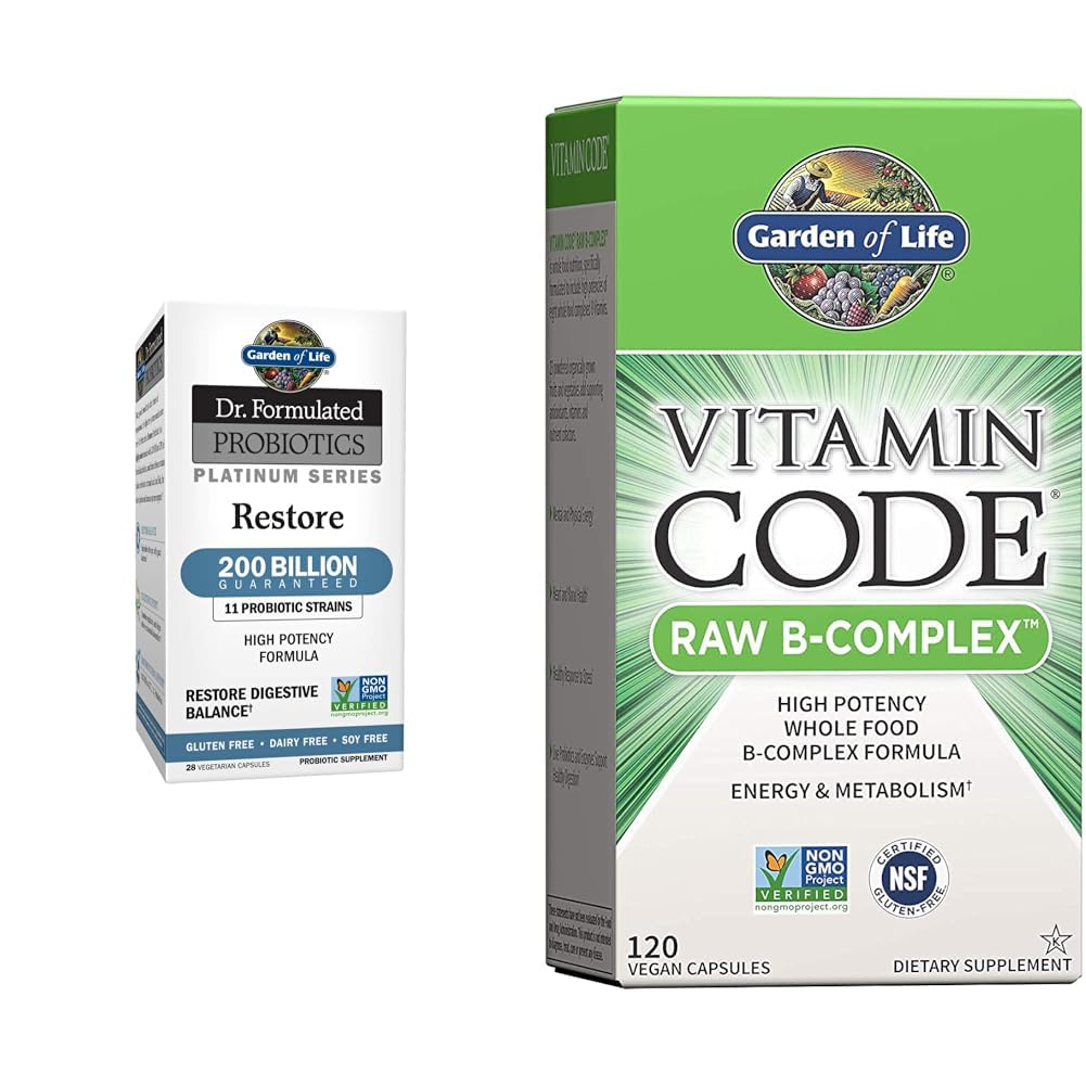 Garden of Life Dr. Formulated Probiotics Platinum Series Restore 200 Billion CFU High Potency Formula, Vegan, Non-GMO, Gluten, Dairy Soy Free Digestive Immune Probiotic Support, 28 Capsules Working on the forefront of the human microbiome, and informed by emerging science, Dr. Perlmutter formulated this new "Platinum" Series with cutting edge probiotic strains, complementary clinically researched ingredients and high-cfu counts. The Platinum series meets a growing demand for therapeutic, effective and unique nutritional products, personalized to individual health concerns. During and immediately after times of compromise, the digestive sustem needs extra care. Restore probiotic is a highly potent formula with 200 billion CFU of beneficial probiotics, Made from diverse strains that are resistant to stomach acid and bile, for extra digestive and immune system support. Garden of Life Vitamin B Complex - Vitamin Code Raw B Complex - 120 Vegan Capsules, High Potency B Complex Vitamins for Energy Metabolism with B6, Folate B12 as Methylcobalamin plus Probiotics The B group of vitamins is an eight-member family of water soluble vitamins which means they are not easily stored in the body and need to be replenished frequently. Their functions are so interrelated that it is suggested they be taken together so they can work harmoniously and perform at their peak levels. Cellular energy production is the most important function of the B complex vitamins and they are known as the catalytic spark plugs of our body. Providing mental and physical energy, supporting healthy blood, a healthy heart, immune system function and a healthy response to stress, the B complex vitamins are essential nutrients for the body. By Garden of Life.Product 2: PROBIOTICS ENZYMES: Featuring raw Lactobacillus probiotics and digestive enzymes Lipase, Protease, Bromelain, Lactase, Papain more to support healthy digestion Adults take 2 capsules daily, or open capsules mix contents with water or juice. Product 2: HEART HEALTH: Our B Complex vitamin supplement is whole food nutrition with 133 mcg of vitamin B-12 (5542 DV), 450 mcg DFE of folate (113 DV) and 10mg of vitamin B6 (588 DV) for heart blood health—plus 325 mcg of biotin (1083 DV), fruits veggies. Product 2: ENERGY SUPPLEMENT: High potencies of 8 whole food complexed B vitamins to support mental physical energy-thiamin (B1), riboflavin (B2), niacin (B3), pantothenic acid (B5), B6, biotin (B7), folate (B9, no synthetic folic acid) B12 (as Methylcobalamin). Product 2: B COMPLEX VITAMINS FOR WOMEN AND MEN: Our high potency vitamin B complex supports energy, metabolism and immune system health as well as a healthy response to stress with B vitamins, Raw Organic fruits and vegetables as well as raw probiotics enzymes. Product 1: Non-GMO Project Verified, Gluten Free, Vegan, Dairy Free, Soy Free. Product 1: Immune System support: 200 Billion CFU guaranteed, 11 Probiotics. Product 1: Digestive support: promotes digestive balance and regularity and helps relieve occasional discomfort. Product 1: Restore balance: replenishes the gut with Good bacteria.
